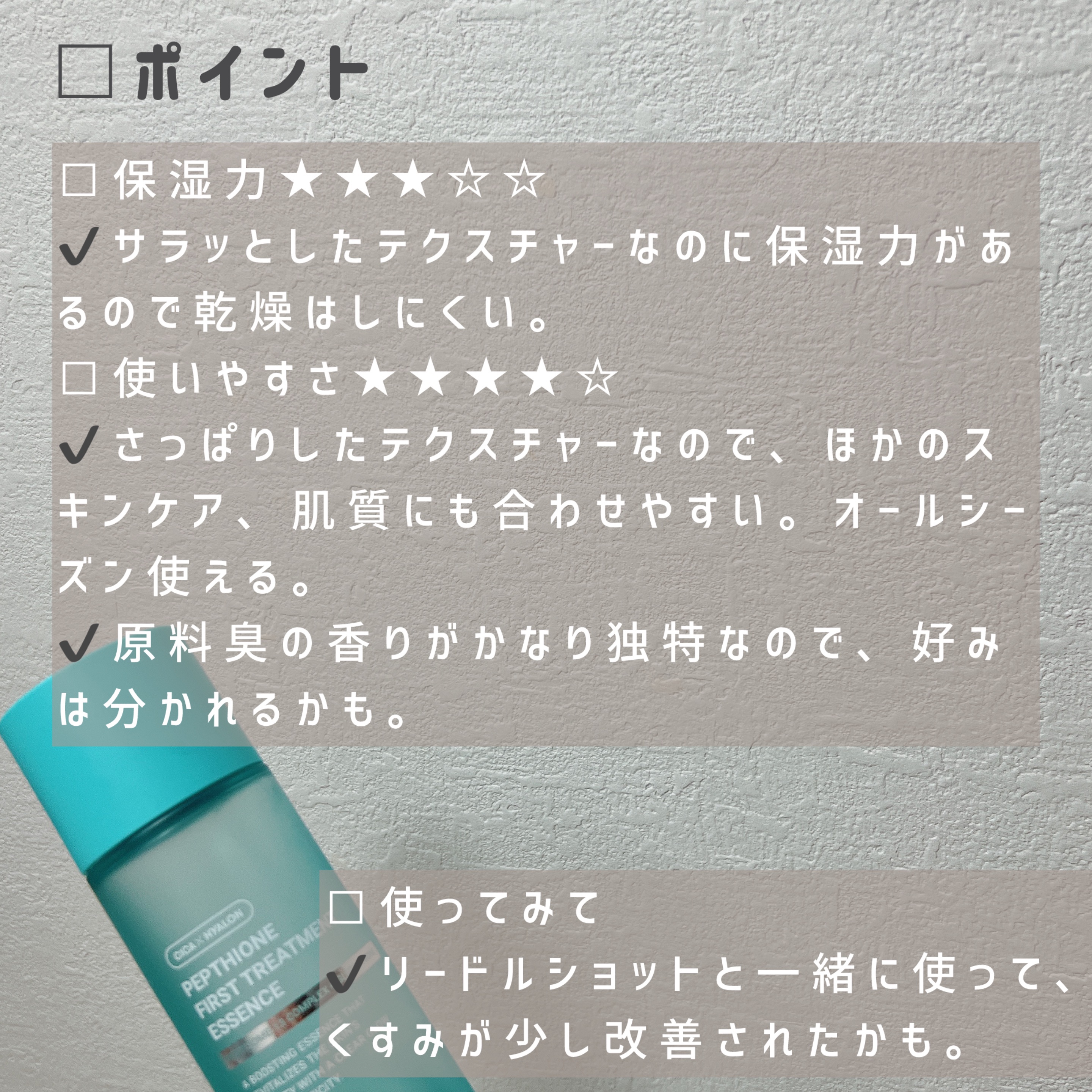 COSRX RXザ・6ペプチドスキンブースターセラム 150ml ・次に使うアイテムのブースター。 VT ペプチオン ファースト トリートメントエッセンス 120ml ・グルタチオン、透明感をしっかり感じた。 ナンバーズイン 1番 青草たっぷり93%整肌トナー 300ml ・使い続けて、鎮静効果を実感。