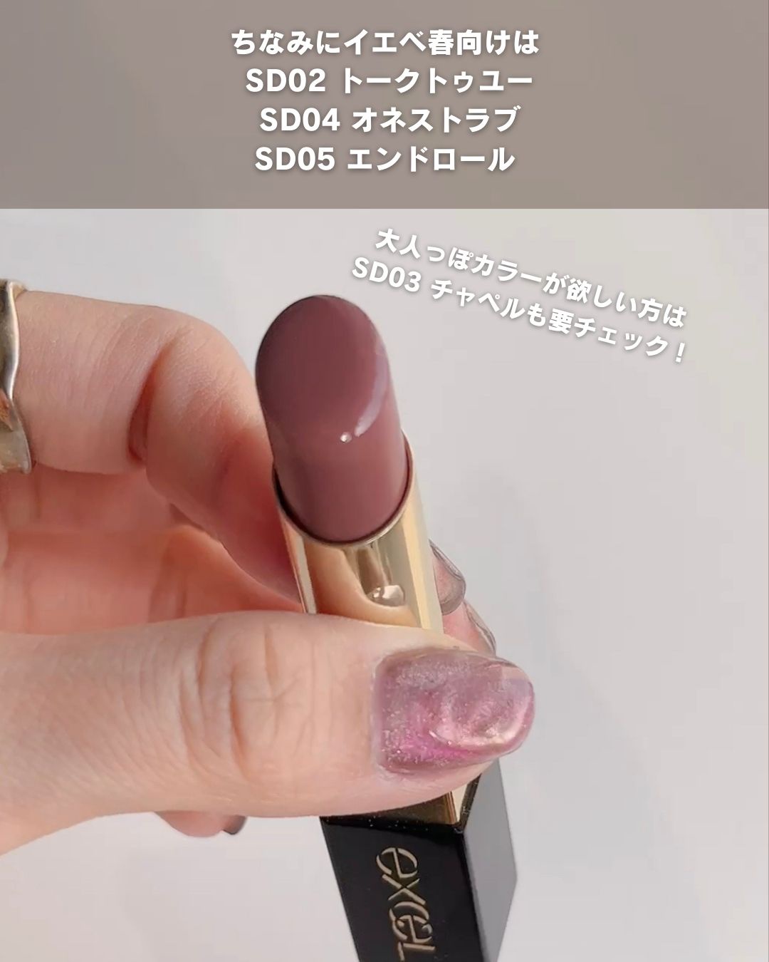 - 永遠に変わらない魅力を秘めたベージュだけを厳選した、極上ニュアンスカラーの美容液リップです。 とろけるようなテクスチャー、絶妙な色味、プランプ効果*1のすべてを叶える絶妙なバランスを追求し、発売まで2年を要したこだわりのアイテムです。 どんなシチュエーションにも合わせられ、素の唇の美しさを引き立てる極上ベージュカラー。 どなたでも似合う“運命の1本”が見つかるニュアンスカラーラインアップです。 程よいシアーな発色で唇の血色感も残しつつ、ベージュの中に赤みを数滴混ぜたような絶妙カラーだけを厳選しました。 プランプ効果*1でふっくら艶めく唇を演出し、ひと塗りで気になる乾燥を予防し唇の縦じわをカバーします*1。 唇の上にとろけるようなオイル膜を形成し、ぴたっと密着してヨレを防ぎます。 美容液97%*2のトリートメント感覚リップです。 *1 メイクアップ効果による *2 仕上がり効果粉末を除く成分 4月9日よりエクセル公式オンラインショップ及び amazon にて先行販売