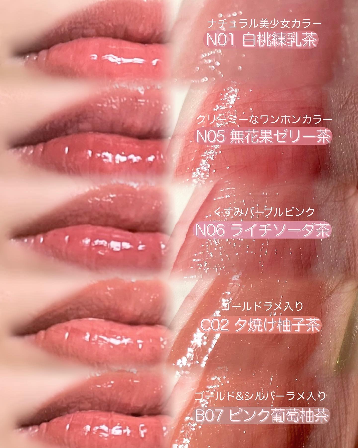- <N01 白桃練乳茶> 水、リンゴ酸ジイソ ステアリル、ジフェニルジメチ コン、ビスジグリセリルポリア シルアジペート-2、水添ポリ イソブテン、オクチルドデカ ノール、グリセリン、ポリソル ベート60、ダイマージリノー ル酸ダイマージリノレイルビス (ベヘニル/イソステアリル/ フィトステリル)、DPG、イソ ステアリン酸ソルビタン、セチ ルPEG/PPG-10/1ジ メチコン、ペンチレングリコー ル、セテアレス-20、香料、(ア クリル酸ヒドロキシエチル/ア クリロイルジメチルタウリンN a)コポリマー、ヒドロキシア セトフェノン、スクワラン、B G、ルリジサ種子油、トリイソ ステアリン酸ポリグリセリル- 2、フィチン酸Na、ジイソス テアリン酸ポリグリセリル- 2、エチレンジアミンジコハク 酸3Na、トコフェロール、ツ ボクサエキス、テオブロマグラ ンジフロルム種子脂、1,2- ヘキサンジオール、モモ花エキ ス、ムシゴケ葉エキス、ハナビ ラタケエキス、エチルへキシル グリセリン、EDTA-2Na、酸化チタン、赤202、酸化鉄、黄5、赤227、青1 <N03 グァバピーチ茶> 水、リンゴ酸ジイソステアリル、ジフェニルジメチコン、ビスジグリセリルポリアシルアジペート-2、水添ポリイソブテン、オクチルドデカノール、グリセリン、ポリソルベート60、ダイマージリノール酸ダイマージリノレイルビス(ベヘニル/イソステアリル/フィトステリル)、DPG、イソステアリン酸ソルビタン、セチルPEG/PPG-10/1ジメチコン、ペンチレングリコール、セテアレス-20、香料、(アクリル酸ヒドロキシエチル/アクリロイルジメチルタウリンNa)コポリマー、ヒドロキシアセトフェノン、スクワラン、トリイソステアリン酸ポリグリセリル-2、BG、ルリジサ種子油、ツボクサエキス、テオブロマグランジフロルム種子脂、モモ花エキス、ムシゴケ葉エキス、ハナビラタケエキス、フィチン酸Na、エチレンジアミンジコハク酸3Na、ジイソステアリン酸ポリグリセリル-2、トコフェロール、1,2-ヘキサンジオール、エチルヘキシルグリセリン、EDTA-2Na、酸化鉄、酸化チタン、赤227、赤202、黄5、青1 <V04 桜ルイボス茶> 水、リンゴ酸ジイソステアリル、ジフェニルジメチコン、ビスジグリセリルポリアシルアジペート-2、水添ポリイソブテン、オクチルドデカノール、グリセリン、ポリソルベート60、ダイマージリノール酸ダイマージリノレイルビス(ベヘニル/イソステアリル/フィトステリル)、DPG、イソステアリン酸ソルビタン、セチルPEG/PPG-10/1ジメチコン、ペンチレングリコール、セテアレス-20、香料、ホウケイ酸(Ca/Al)、(アクリル酸ヒドロキシエチル/アクリロイルジメチルタウリンNa)コポリマー、ヒドロキシアセトフェノン、スクワラン、トリイソステアリン酸ポリグリセリル-2、BG、ルリジサ種子油、ジイソステアリン酸ポリグリセリル-2、フィチン酸Na、エチレンジアミンジコハク酸3Na、酸化スズ、トコフェロール、ツボクサエキス、テオブロマグランジフロルム種子脂、1,2-ヘキサンジオール、モモ花エキス、ムシゴケ葉エキス、ハナビラタケエキス、エチルへキシルグリセリン、EDTA-2Na、酸化チタン、黄4、赤227、赤202、酸化鉄、赤104(1)、青1 <N05 無花果ゼリー茶> 水、リンゴ酸ジイソ ステアリル、ジフェニルジメチ コン、ビスジグリセリルポリア シルアジペート-2、水添ポリ イソブテン、オクチルドデカ ノール、グリセリン、ポリソル ベート60、ダイマージリノー ル酸ダイマージリノレイルビス (ベヘニル/イソステアリル/ フィトステリル)、DPG、イソ ステアリン酸ソルビタン、セチ ルPEG/PPG-10/1ジ メチコン、ペンチレングリコー ル、セテアレス-20、香料、(ア クリル酸ヒドロキシエチル/ア クリロイルジメチルタウリンN a)コポリマー、トリイソステ アリン酸ポリグリセリル-2、ヒドロキシアセトフェノン、ス クワラン、BG、ルリジサ種子 油、フィチン酸Na、エチレン ジアミンジコハク酸3Na、ト コフェロール、ツボクサエキス、テオブロマグランジフロルム種 子脂、1,2-ヘキサンジオー ル、モモ花エキス、ムシゴケ葉 エキス、ハナビラタケエキス、エチルへキシルグリセリン、E DTA-2Na、赤227、酸 化チタン、酸化鉄、黄5、赤1 04(1)、青1 <N06 ライチソーダ茶> 水、リンゴ酸ジイソ ステアリル、ジフェニルジメチ コン、ビスジグリセリルポリア シルアジペート-2、水添ポリ イソブテン、オクチルドデカ ノール、グリセリン、ポリソル ベート60、ダイマージリノー ル酸ダイマージリノレイルビス (ベヘニル/イソステアリル/ フィトステリル)、DPG、イソ ステアリン酸ソルビタン、セチ ルPEG/PPG-10/1ジ メチコン、ペンチレングリコー ル、セテアレス-20、香料、(ア クリル酸ヒドロキシエチル/ア クリロイルジメチルタウリンN a)コポリマー、ヒドロキシア セトフェノン、スクワラン、B G、トリイソステアリン酸ポリ グリセリル-2、ルリジサ種子 油、ジイソステアリン酸ポリグ リセリル-2、フィチン酸Na、エチレンジアミンジコハク酸3 Na、トコフェロール、ツボク サエキス、テオブロマグランジ フロルム