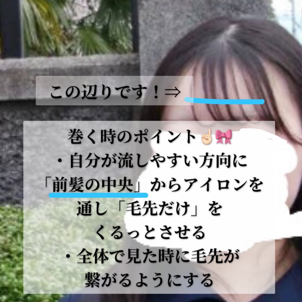 私は3ゾーンに分けて切ってます! 中心(目と目の間くらいに位置する前髪)と 両サイド(触角は含まない)で三角形を作ります! 中心の前髪をヘアアイロンで巻きます! 毛先だけ内側にくるっとします 両サイドはアイロンで挟み、真横にスライドさせます おでこが見えるシースルー前髪の出来上がりです!