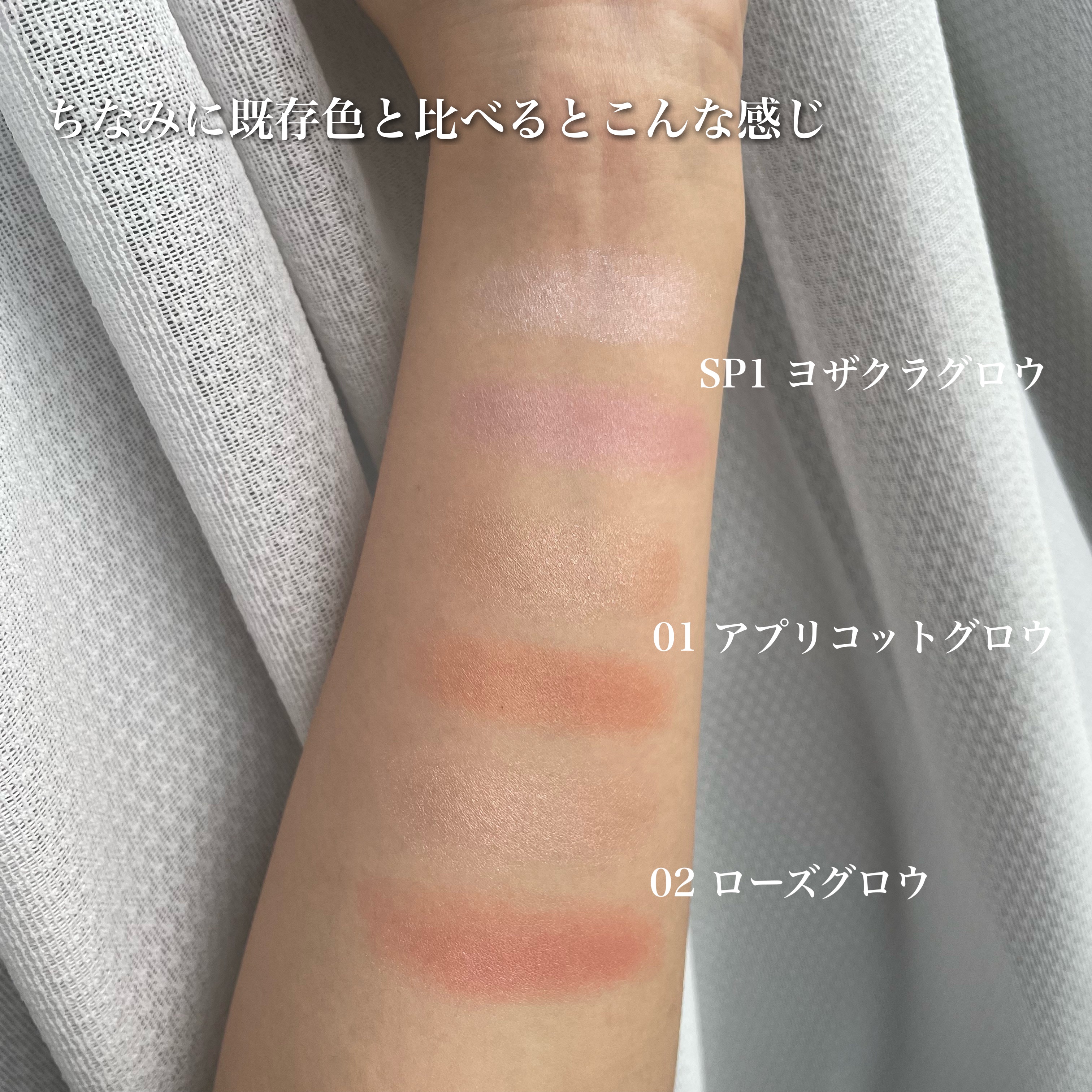 - <01 アプリコットグロウ> トリエチルヘキサノイン、ジメチコン、合成フルオロフロゴパイト、(ジメチコン/ビニルジメチコン)クロスポリマー、リンゴ酸ジイソステアリル、シリカ、窒化ホウ素、マイクロクリスタリンワックス、パラフィン、スクワラン、ホホバ種子油、マンゴー種子脂、ヒマワリ種子油、マカデミア種子油、ヤシ油、セラミドNP、ローズマリー葉エキス、アロエベラ葉エキス、加水分解コラーゲン、フェノキシエタノール、トコフェロール、メチルパラベン、タルク、マイカ、酸化チタン、酸化鉄、赤226、コンジョウ、水酸化Al、酸化スズ <02 ローズグロウ> トリエチルヘキサノイン、ジメチコン、合成フルオロフロゴパイト、(ジメチコン/ビニルジメチコン)クロスポリマー、リンゴ酸ジイソステアリル、シリカ、窒化ホウ素、マイクロクリスタリンワックス、パラフィン、スクワラン、ホホバ種子油、マンゴー種子脂、ヒマワリ種子油、マカデミア種子油、ヤシ油、セラミドNP、ローズマリー葉エキス、アロエベラ葉エキス、加水分解コラーゲン、フェノキシエタノール、トコフェロール、メチルパラベン、タルク、マイカ、酸化チタン、酸化鉄、赤226、コンジョウ、水酸化Al、酸化スズ、赤202 <03 ロマンスグロウ> トリエチルヘキサノイン、ジメチコン、合成フルオロフロゴパイト、(ジメチコン/ビニルジメチコン)クロスポリマー、リンゴ酸ジイソステアリル、シリカ、窒化ホウ素、マイクロクリスタリンワックス、パラフィン、スクワラン、ホホバ種子油、マンゴー種子脂、ヒマワリ種子油、マカデミア種子油、ヤシ油、セラミドNP、ローズマリー葉エキス、アロエベラ葉エキス、加水分解コラーゲン、フェノキシエタノール、トコフェロール、メチルパラベン、タルク、マイカ、酸化チタン、酸化鉄、赤226、コンジョウ、水酸化Al、酸化スズ、赤202 <SP1 ヨザクラグロウ> トリエチルヘキサノイン、ジメチコン、合成フルオロフロゴパイト、(ジメチコン/ビニルジメチコン)クロスポリマー、リンゴ酸ジイソステアリル、シリカ、窒化ホウ素、マイクロクリスタリンワックス、パラフィン、スクワラン、ホホバ種子油、マンゴー種子脂、ヒマワリ種子油、マカデミア種子油、ヤシ油、セラミドNP、ローズマリー葉エキス、アロエベラ葉エキス、加水分解コラーゲン、フェノキシエタノール、トコフェロール、メチルパラベン、タルク、マイカ、酸化チタン、酸化鉄、赤226、赤202、コンジョウ、グンジョウ、水酸化Al、酸化スズ