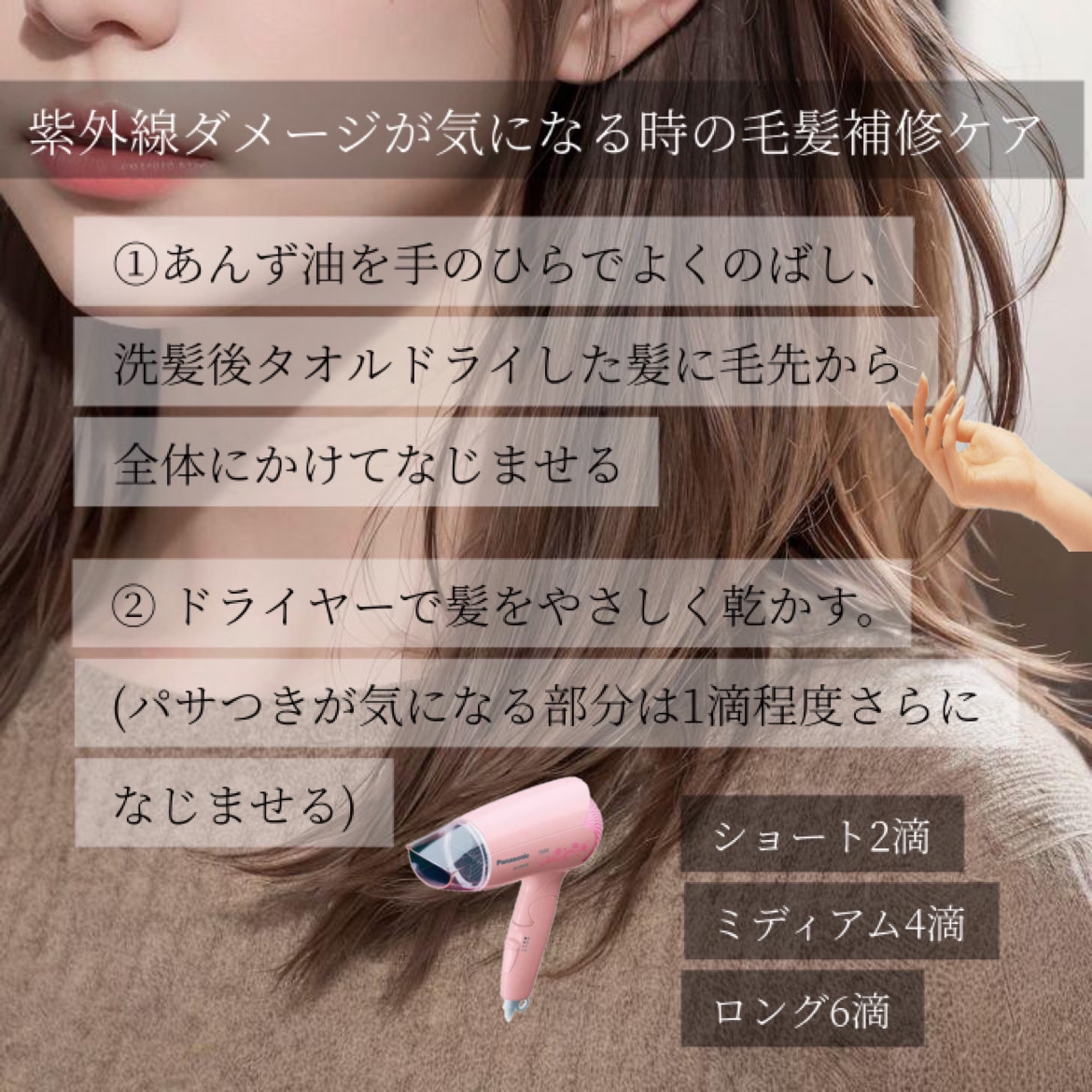 天然のあんず種子からしぼられた不乾性オイルオレイン酸やミネラルを多く含み、浸透しやすいのでベタつかず髪を保湿・保護します。 ツヤがでて、サラサラに仕上がりました。 あんずの香りがほのかに髪に残って良い感じです。 香りが強すぎないのも使いやすいです。 1回の量も少量でいいので、コスパも良いと思います。