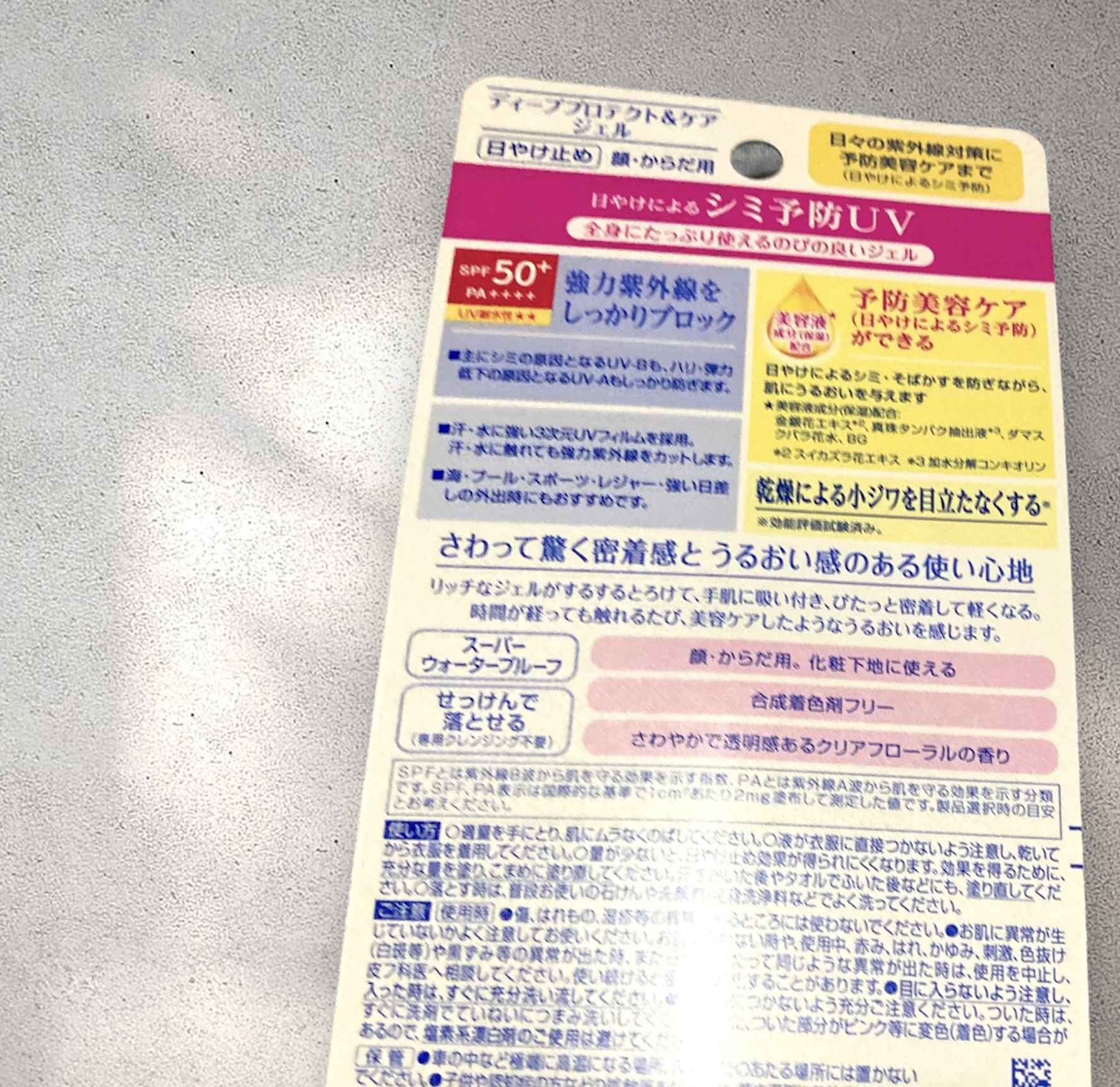 - 全身たっぷり使えるのびのいいジェル 強力紫外線をしっかりブロックしながら、予防美容(日やけによるシミ予防*1)ができる美容ケアUV *1日やけによるシミ・ソバカスを防ぐ ■SPF50+/PA++++ ハリ・弾力低下の原因となるUV-Aも、主にシミの原因となる UV-Bも防ぎます。 ■汗・水に強い3次元UVフィルムを採用 スーパーウォータープルーフで汗・水に触れても強力紫外線をカットします。(80分間の耐水試験で確認済み) ●日やけによるシミ・そばかすを防ぎながら、肌にうるおいを与えます。美容液成分★(保湿)配合。 ★ジェル:金銀花エキス*5、真珠タンパク抽出液*6、ダマスクバラ花水、BG ★エッセンス: 金銀花エキス*5、真珠タンパク抽出液*6、チューベロース多糖体、BG *5スイカズラ花エキス *6 加水分解コンキオリン ●乾燥による小ジワを目立たなくする*3 *3効能評価試験済み ●さわって驚く密着感とうるおい感のある使い心地