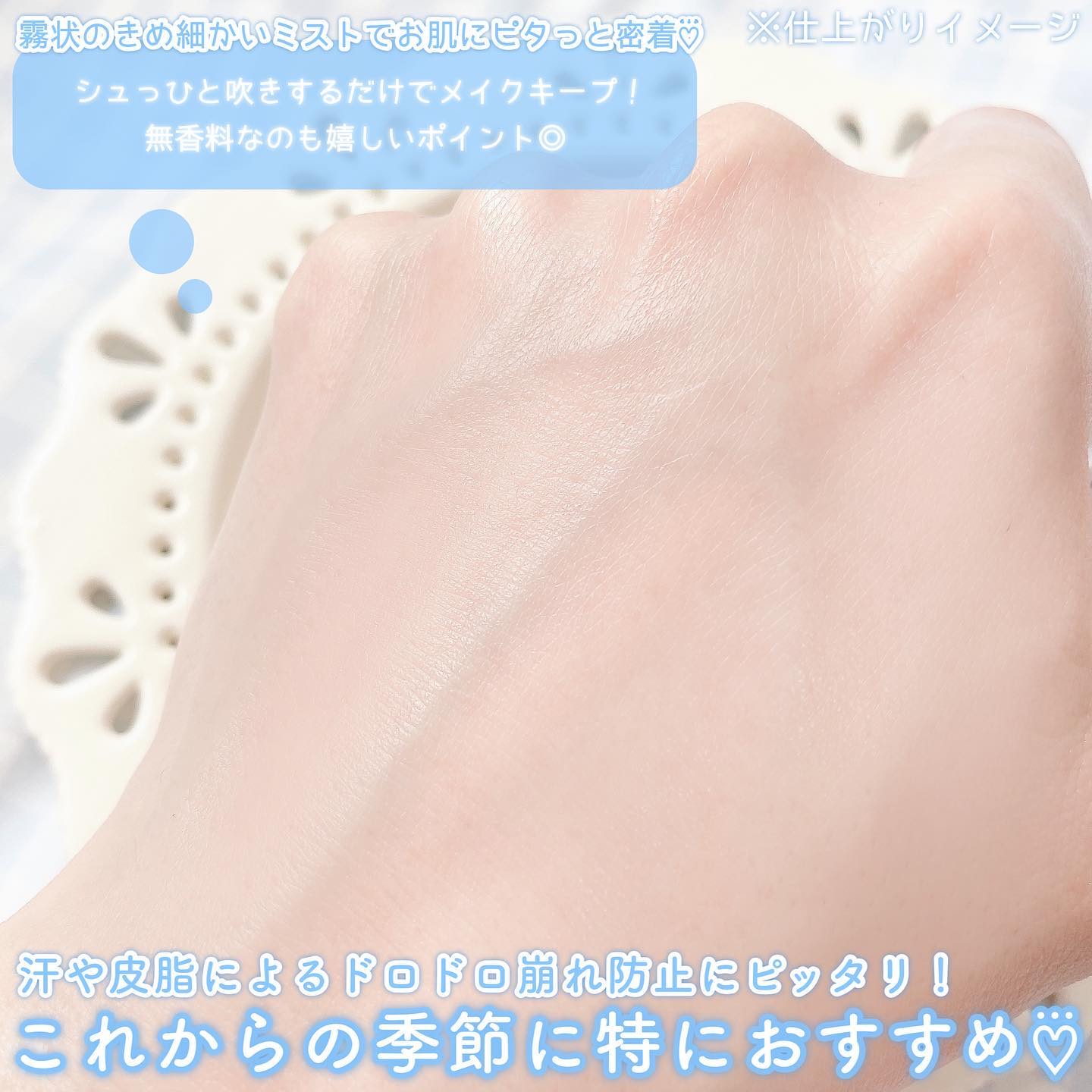 - マスクによるメイク崩れに! 1日中メイクしたてのお肌をキープする メイクキープスプレー ・ふんわり微粒子ミスト ・皮脂崩れ / 乾燥崩れ どちらも防ぐ ・パラベンフリー、エタノールフリー、鉱物油フリー ・無香料で使い心地さっぱり 保湿成分がお肌にうるおいを与えテカリを防止 キープ成分がお肌表面の崩れを防止 うるおってキープするW処方でメイクを守ります!
