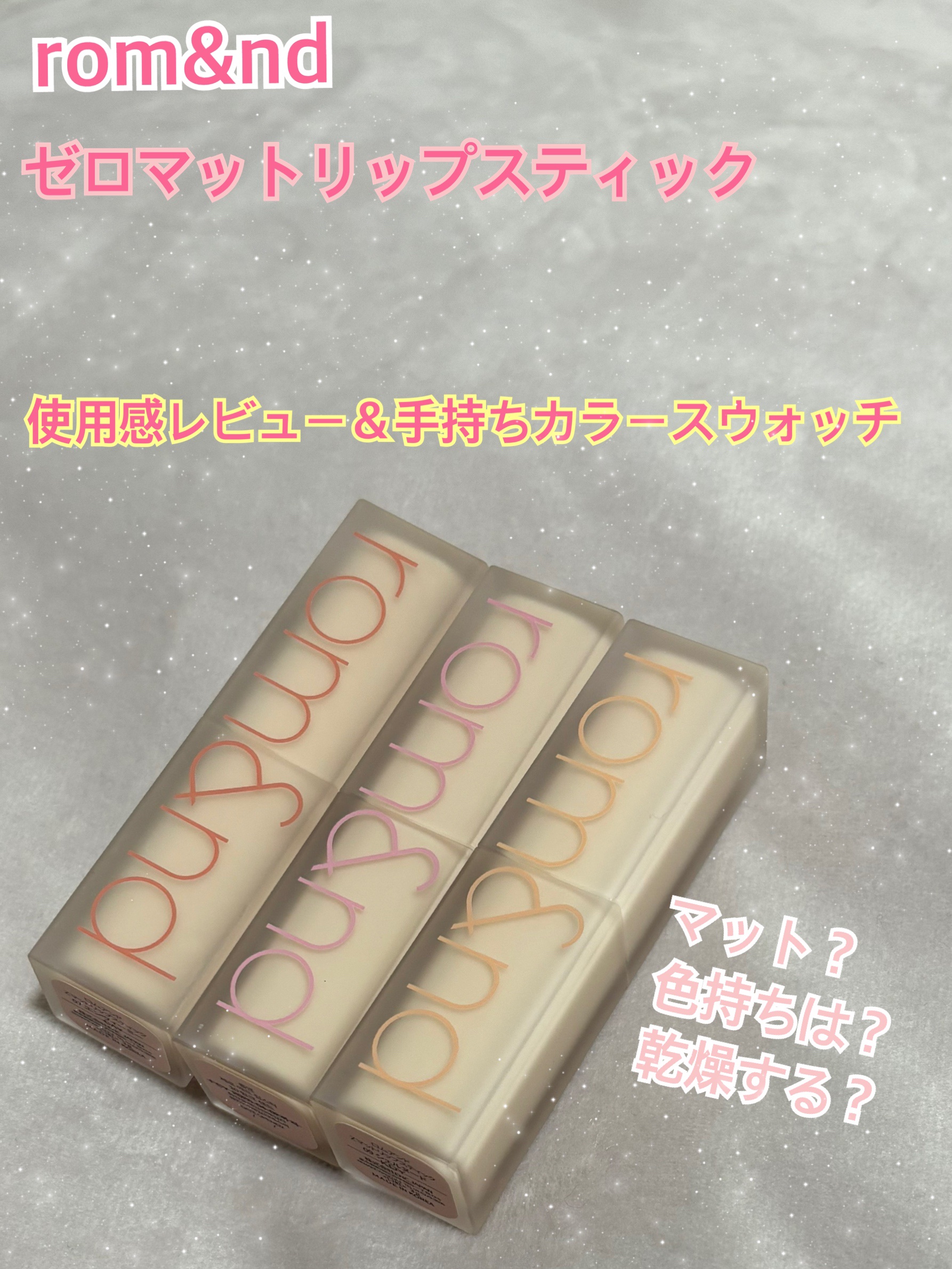 \質感可愛すぎる!!/rom&ndのふんわりマットリップ♥️rom&ndゼロマットリップスティック¥1320何も塗ってないかのような軽いタッチ感♡塗ったとたんピッタリ密着!!ふんわり軽くてスルスル塗れる️🫧すりガラス風のパケもオシ...