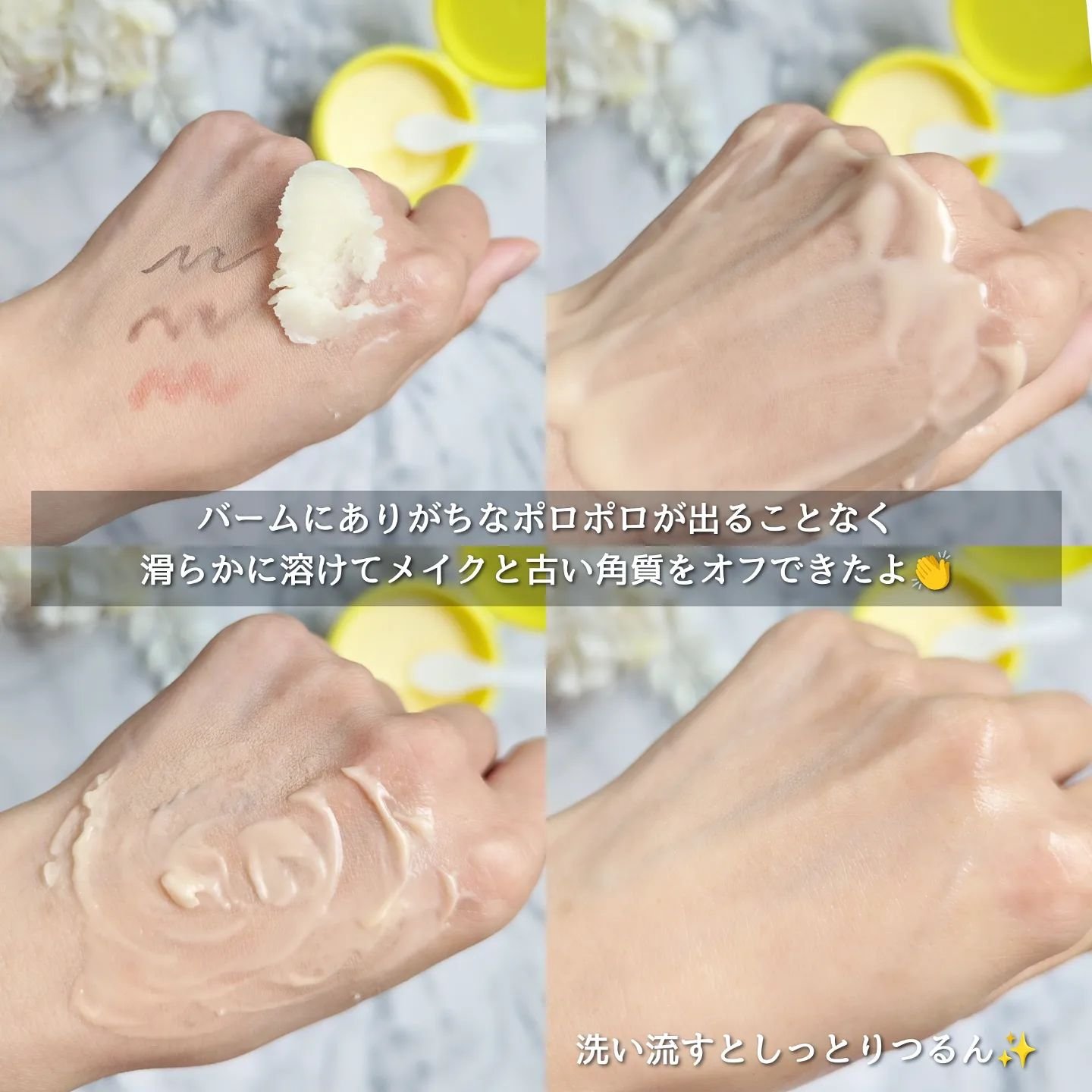 | バームを肌に乗せて撫でるとすぐに オイルみたいにみずみずしく変化✨ | 詳細を見る | ||