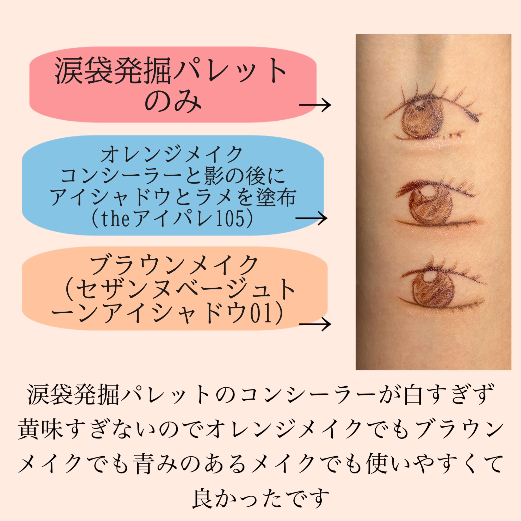ひとつのパレットで簡単に涙袋が偽装できるという。影色とコンシーラー、ラメがセットになった、その名も涙袋発掘パレット。 涙袋を形成するのに必要なカラーが一つにまとまっている。コンシーラーは伸びのいいしっとりタイプ、影色はパウダータイプと質感が違うのが使いやすい。 涙袋作るのが苦手という人にぜひ一度使ってみてほしい。色々と涙袋アイテム使ってきたけど、これはなかなか使いやすい方だと思う🙆♀️