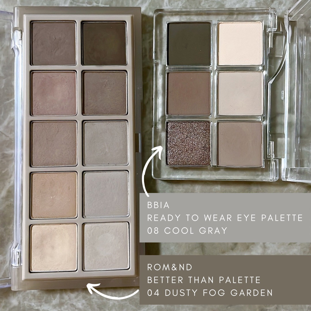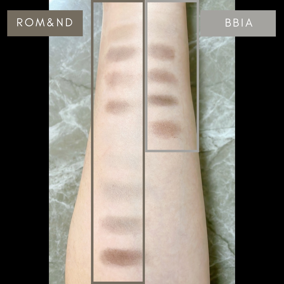 07 ウォームベージュ 全体的に明るめのピーチカラーがベースですが、 黄みがそこまで強くないのでニュートラル寄りで、 ブルベさんにもイエベさんにもおすすめです! 08 クールグレー グレートーンを集めたパレット。 こちらはブルベさんにおすすめです! ロムアンドのほうはラメが入っていません! 比較してみるとどちらも同じくらいの発色で ロムアンドの方がよりスモーキーなグレーです。