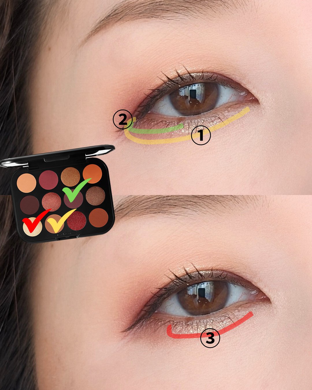 M・A・Cコネクトインカラー【アンフィルタード ヌーズ】黄みをメインにしたナチュラルメイク🥰💕 マスタードブラウンをメインにゴールドラメを上から重ねました✨✨ 全体的にグラデーションになるように、二重幅からアイシャドウを乗せて、ブレンディングブラシで丁寧に上に向かってぼかしていく