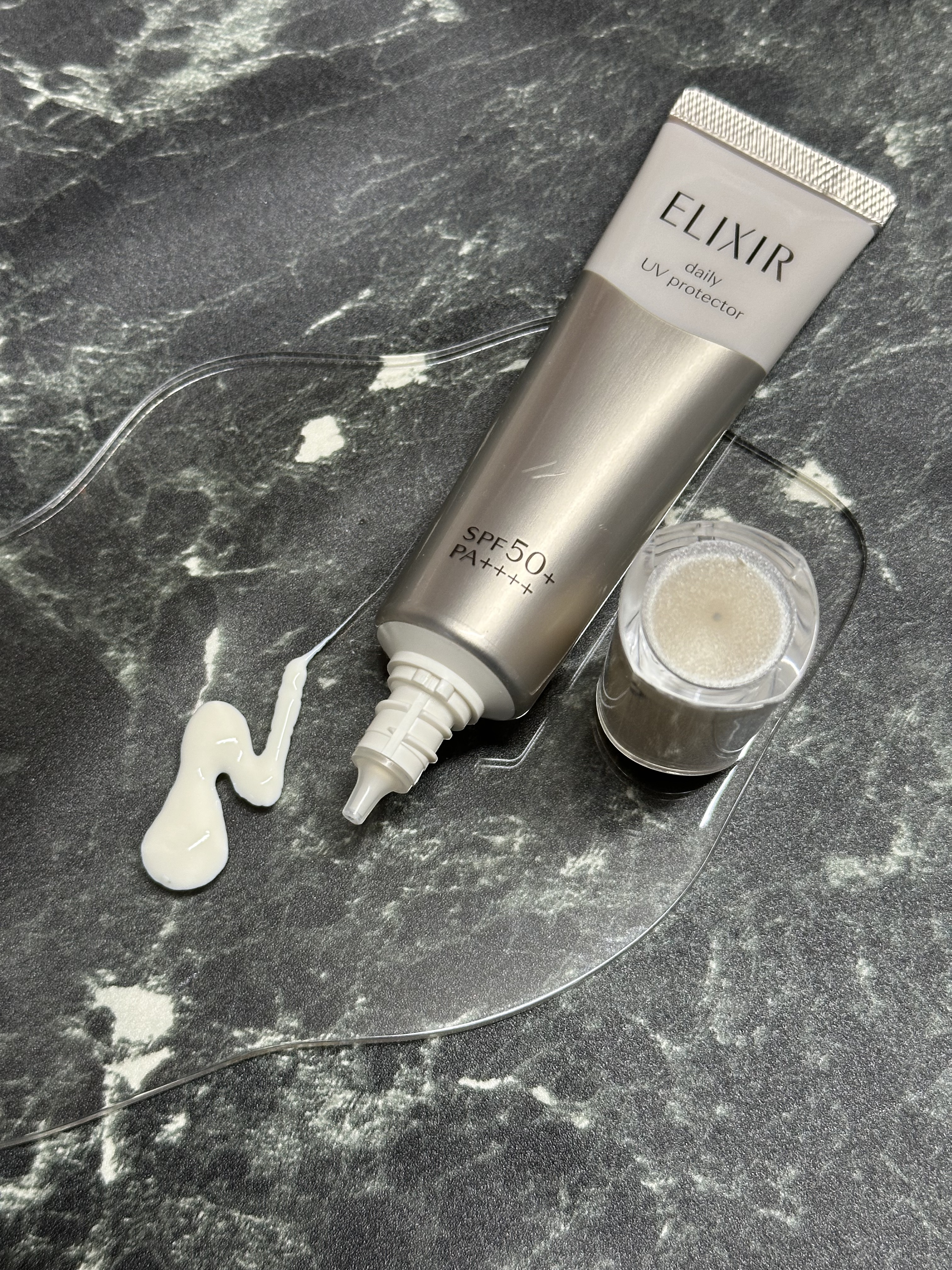 3/21新発売エリクシールの乳液、日焼け止め、化粧下地を兼ねた日中用乳液エリクシールデーケアレボリューション+ba(医薬部外品)SPF50+・PA++++サンプル使用しました。ベージュのパケの方です。ブライトニング(ピンクのパケ)と一緒に...