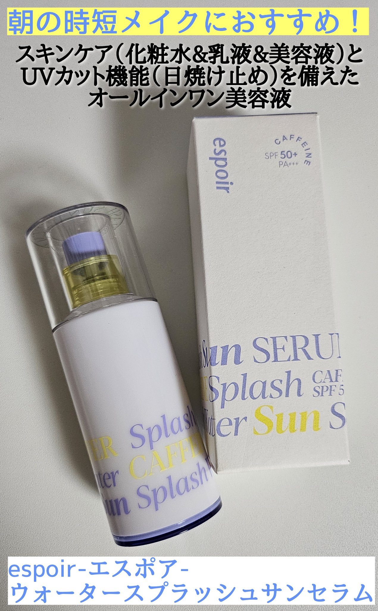 - 忙しい朝にスキンケアと日焼け止めを同時に完了!化粧水、クリーム、日焼け止め、化粧下地まで叶うオールインワン美容液。SPF 50+ / PA +++ カフェイン成分を最適な含量で配合し、朝のむくみをケア。フェイスラインをすっきり整えます。低分子ヒアルロン酸とペプチド配合で、肌を保湿し美容液の効果も。メイクの密着力をアップし、韓国メイクの特徴であるヘルシーなツヤを演出できる化粧下地としても◎ 使用に便利なポンプ式の容器を採用し、さらに時短を実現しました。 <サンクリームCE ミニ付き> +大人気商品エスポアのサンクリームセラミドのミニサイズがセットになって登場! 自然なトーンアップと水分たっぷりの保湿力でナチュラルなツヤを演出します。 【セット内容】 ウォータースプラッシュサンセラム50ml+サンクリームセラミド30ml <サンクリームフレッシュ CICA ミニ付き> +大人気商品エスポアのサンクリームフレッシュCICAのミニサイズがセットになって登場! 自然なトーンアップとさらっとした肌触りが、日焼け止めならではのべたつきをおさえます。CICA成分配合で、肌荒れ中や敏感肌のかたでも安心してご使用いただけます。 【セット内容】 ウォータースプラッシュサンセラム50ml+サンクリームフレッシュCICA30ml