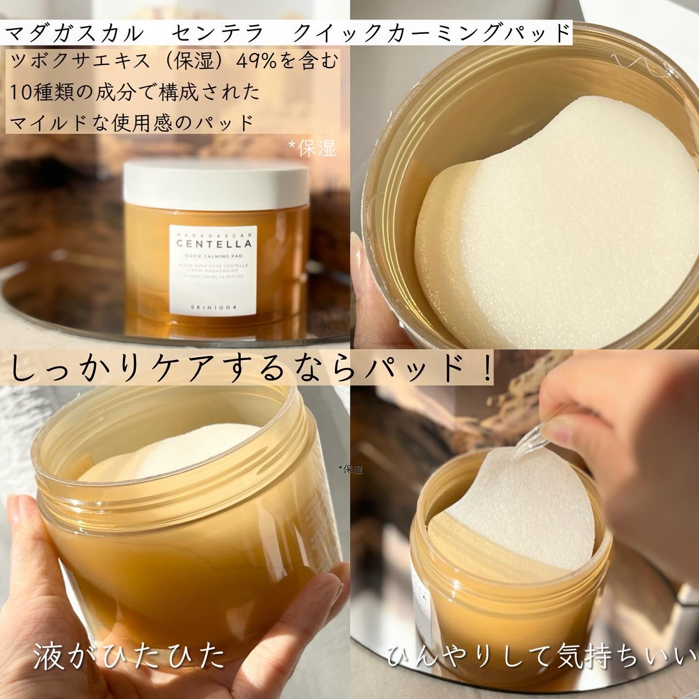 時間がない朝にも1分で水分チャージできる"じゅわぴたパッド"SKIN1004の「センテラクイックカーミングパッド」だよ刺激を受けたお肌にもやさしくケアできるSKIN1004のスキンケアが大好きで、このカーミングパッドもそのひとつ。パッドはお肌...