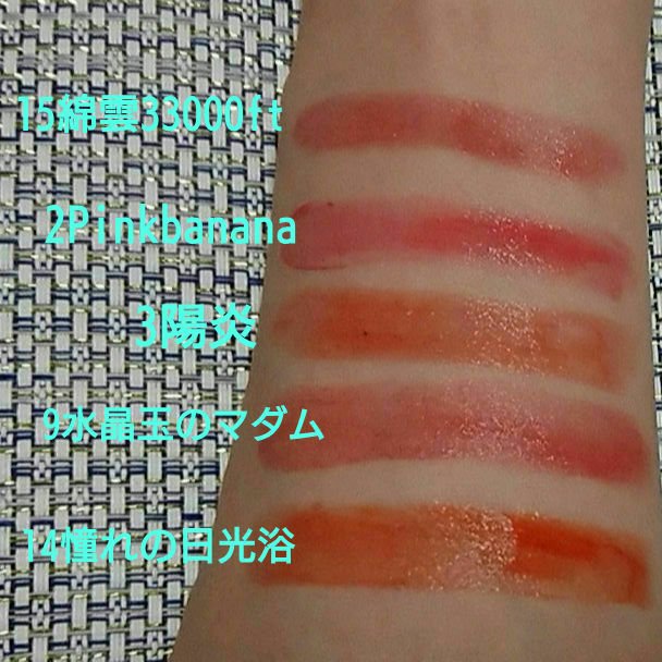 01 欲望の塊 青み寄りの明るめで澄んだピンクレッド やや鮮やかまでいけるブルベ夏、 明るさ得意なブルベ冬におすすめ! 08 モーブシャワー (WEB限定) しっかり青みの淡い青ラメ入りラベンダー 単体なら淡さ得意なブルベ夏に! ブルベ全般の重ねて青み足し要因にも◎ 15 綿雲33000ft (新色) ほんのり黄みの鮮やかめなコーラルレッド 2ndブルベでやや鮮やかまでいけるイエベ春に! 09水晶玉のマダムよりもほんのり柔らかめ◎