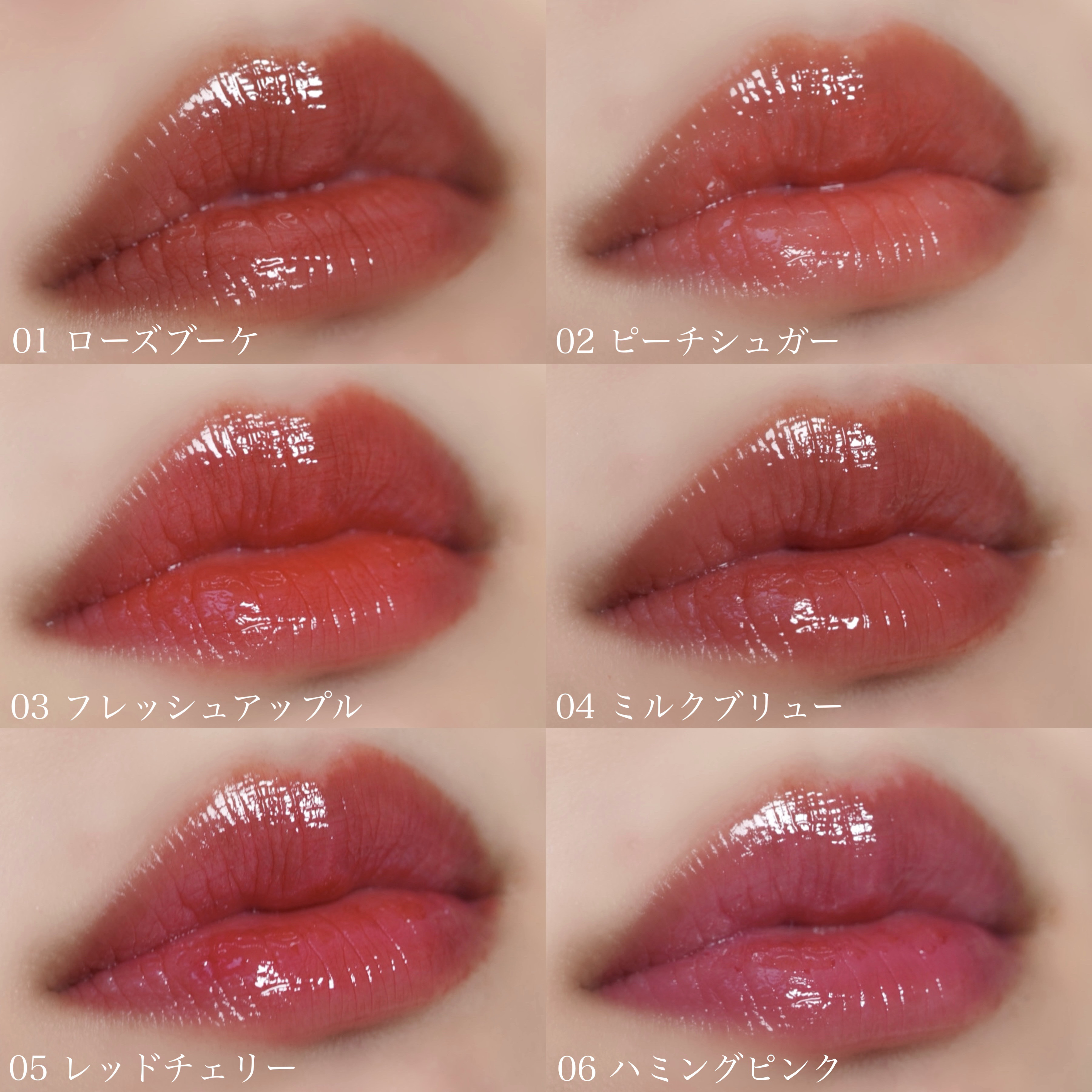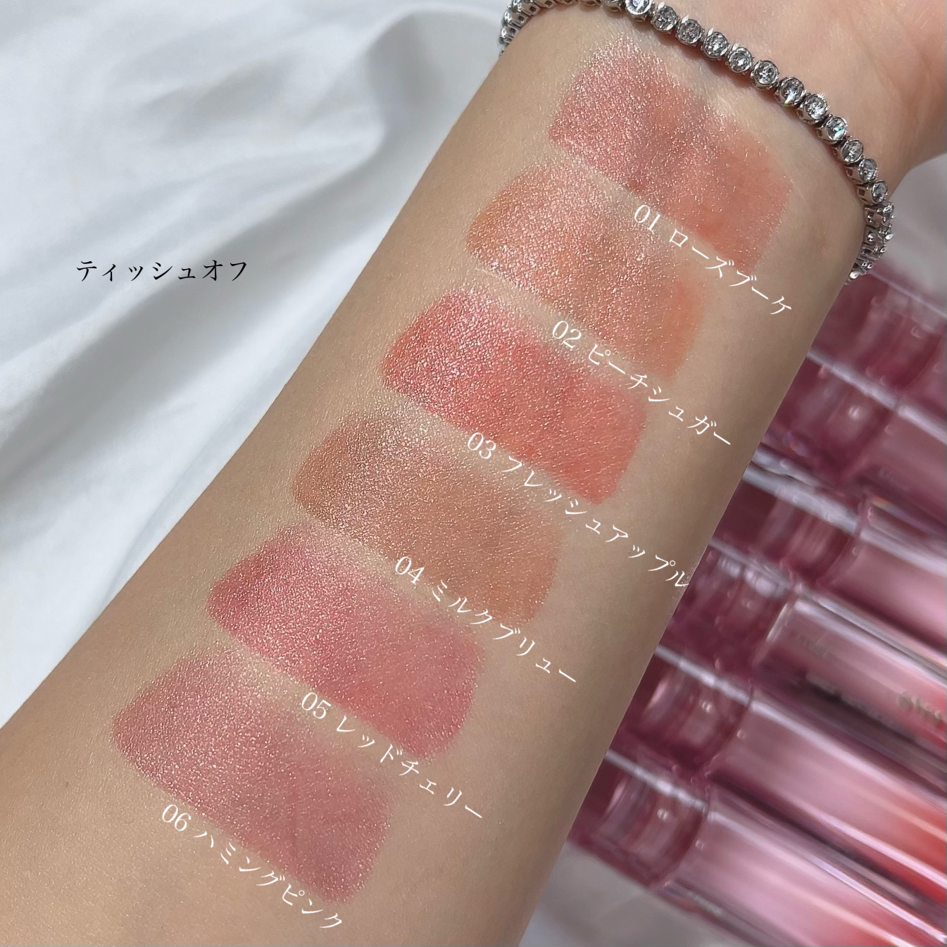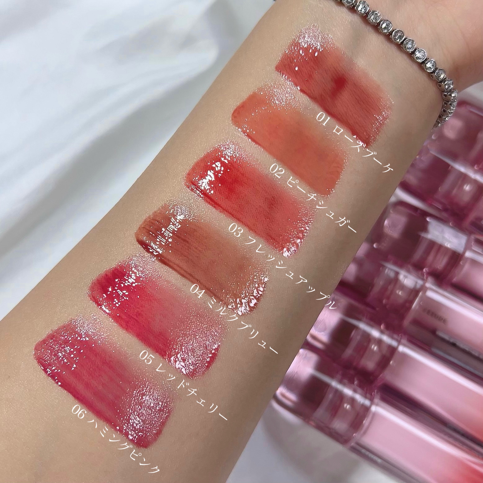 オイル膜が唇をつつみグロスのようなボリュームと光沢感を演出😍 ちゅるんちゅるんな仕上がりで カラバリも比較的どの色も使いやすくて 可愛い〜🤤❤️ パケもコロンとした宝石みたいで可愛い🩷 チップもモケモケで塗りやすいよ!