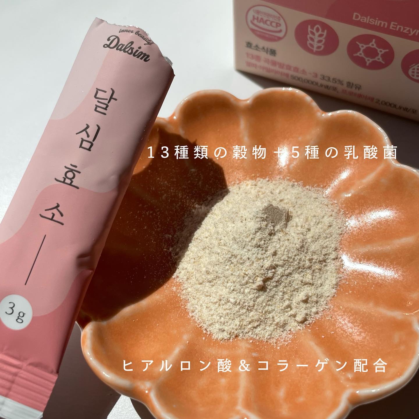 毎日続けられるインナービューティーのダルシム🫶🏽 美味しいのでストレスなく続けられるの🤤 天然原料で作られたむくみケア✨ タンポポ、竹の葉、黒豆、イヌホウズキ、メシマコブ菌糸などの天然成分配合。 韓国の発酵専門会社との共同開発されたパウダータイプの酵素✨ 炭水化物分解酵素が含まれ、食べ過ぎやダイエット中のの食後にオススメ!