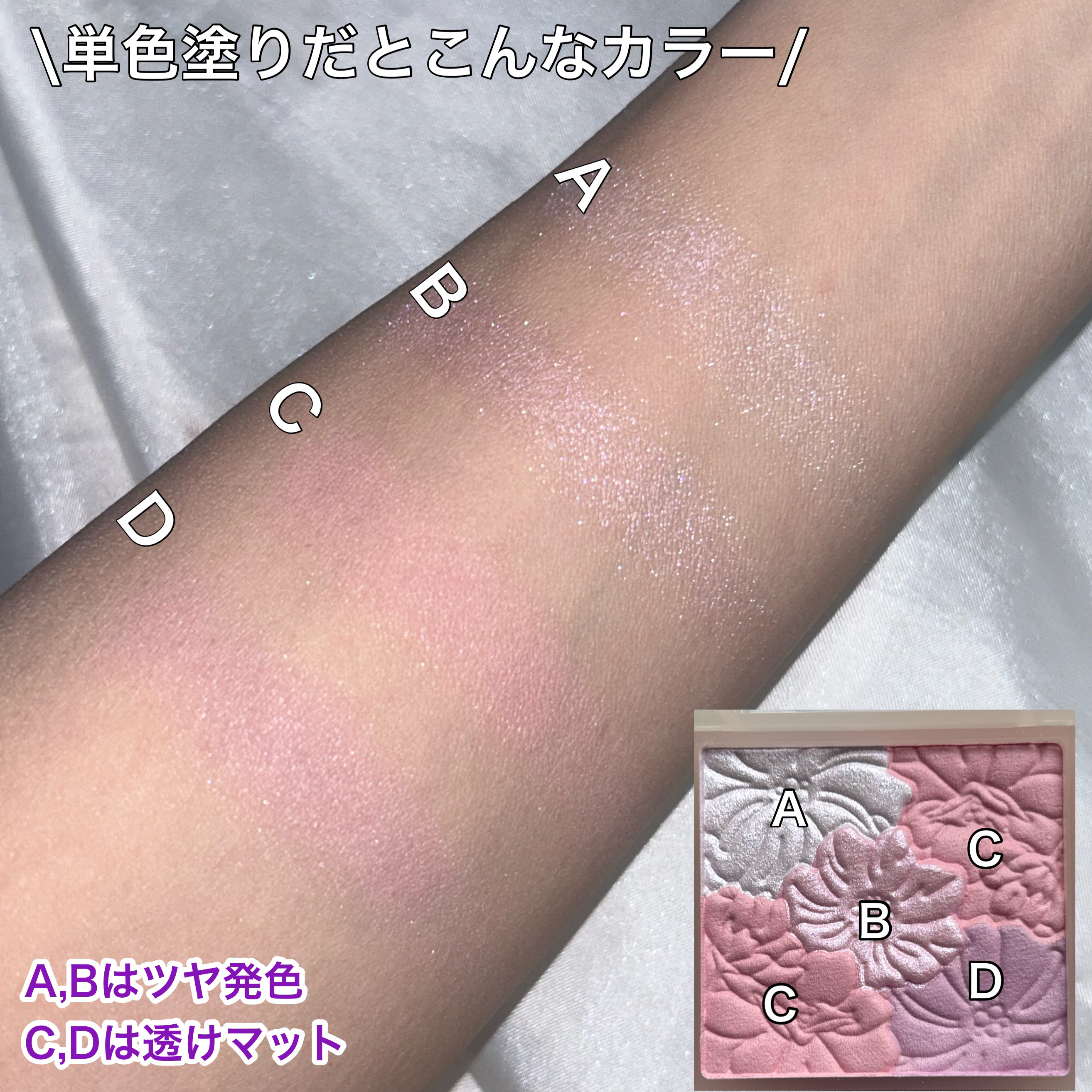 - ”発光ツヤ×透けマット”が1つに 混ぜ方次第で自分好みの仕上がりを作れる4色チーク 透け感のあるマットと繊細パール、2つの質感をブレンドして 肌に溶け込むような透けツヤ発色を楽しめるチーク。 しっとりなめらかなパウダーで、粉飛びしにくく、肌に密着します