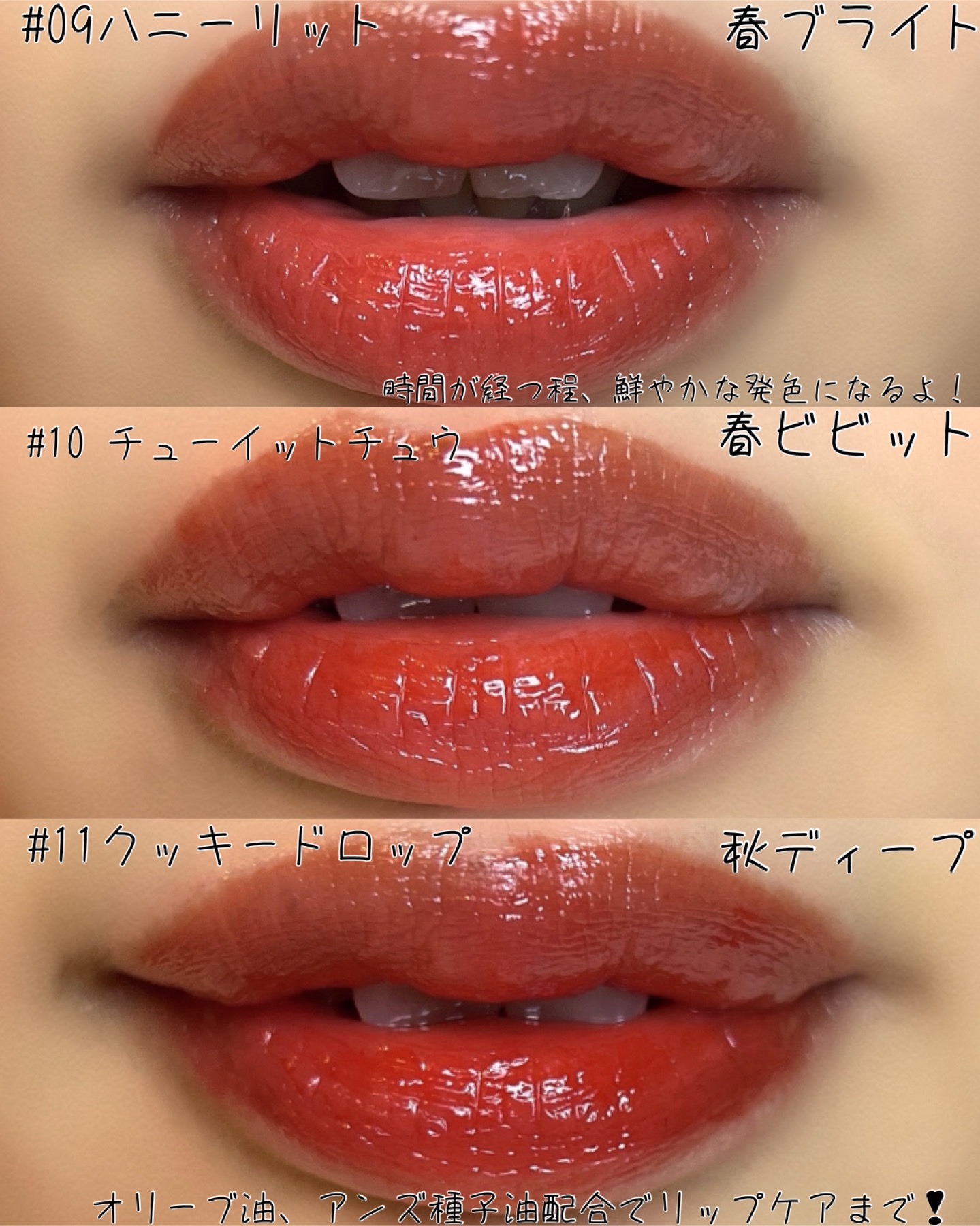 グローティントで高水分フォーミュラで しっかり密着ティント!! 水分とオイルの黄金比!! だから、しっとり✨ でも、サラッとしたつけ心地で 唇の温度に反応して密着力を高めてくれるよ! 100%veganだから唇にも安心だね! 実際、一日中つけていても荒れませんでした😊 でも、しっかりティントなので 油っぽいものを食べなないならとれませんでしたー! 油分が付くとどうしても色落ちはありますが 普通にマスクだけで外出して二、三度テッシュオフすればマスクにはつきませんでした。 潤いがあるのでカサカサにもらなず 久しぶりにヒットでした! ただ、公式にはグローティントと記載がありましたが、そこまでグローでシアーな仕上がりには感じませんでした! しっかり色はつく方だと思います。 レビューでは、色が分かる様に厚塗りにしていますが、指でトントンして調節するとキュートな感じになるかな?と思います😊 お値段は、Q10価格で¥1800 でした😊