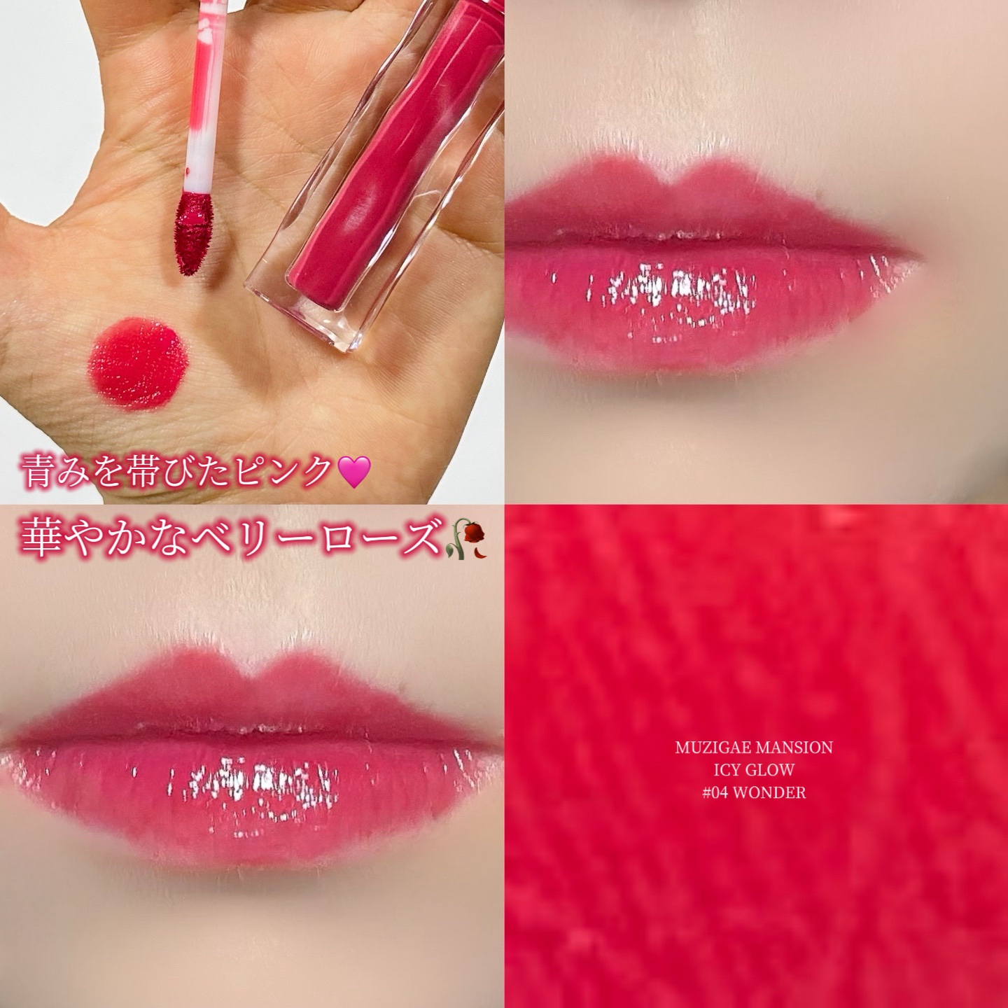 - ムジゲマンションの3つ目のコレクション アイシーグロウはアイスキューブを 洗練された感覚で表現したグロッシーティントです。 アイシーグロウはムジゲマンションのラインナップの中で、最も澄んだ華麗さを感じられるコレクションで、うっすら溶けた氷が作り出す 水光のように水気のあるしっとりとしたリップを演出します。 半透明な処方が本来の唇の色と調和し、幻想的で混じりけのない神秘な雰囲気を醸し出し、 好奇心を動かします。