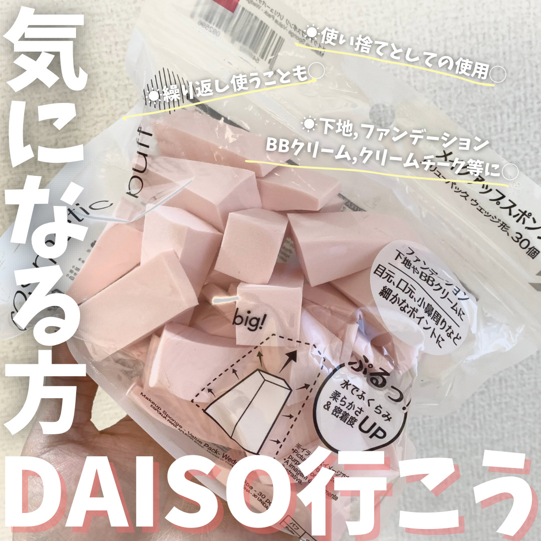 DAISOのメイクスポンジがコスパ良く使えるのを教えてもらってから実際に使用しているのですが値段だけじゃなくて細かいところも塗りやすいのがとてもお気に入りです☀️ 下地,ファンデーション,BBクリーム,クリームチーク等幅広く使用可能 水を含ませてから使用することで肌とファンデーションとの密着力アップ⤴️ スポンジ角が多いので鼻周りや細かいところに塗りやすいデザイン 実際に水を含ませてみると少し膨らみが出てプルプルとした感触になります✨ファンデーションを肌に指で塗った後にパフを使用することでムラなく塗り広げることができ仕上がりが指だけに比べると綺麗でした✨ パフの先端は細かいところに塗りやすいので小鼻周りはとても使いやすくて赤みが出やすいところもカバーしやすかったです✨ 普段簡単なメイクをする時にこのスポンジはとても重宝していてすごく使いやすいんですよね✨