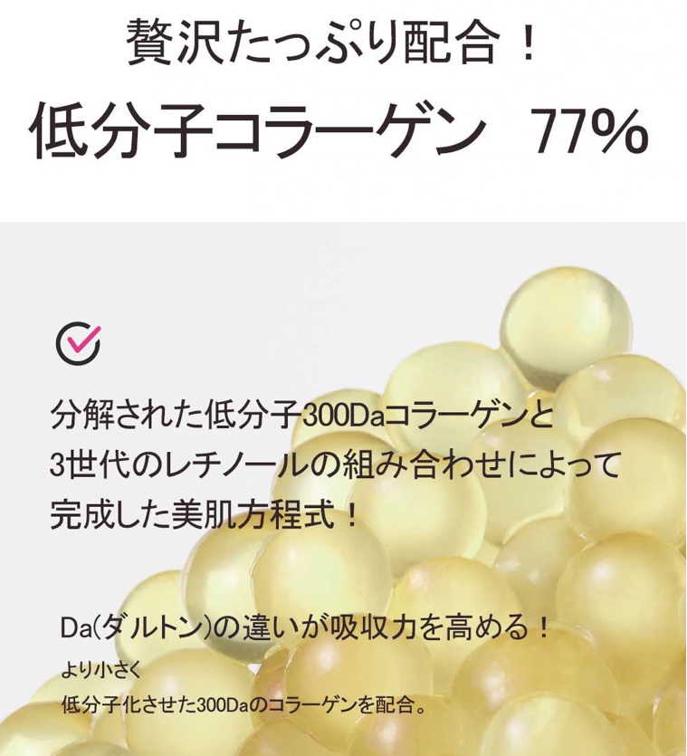 - 加水分解コラーゲンエキス(77%)、プロパンジオール、グリセリン、メチルプロパンジオール、ナイアシンアミド、1,2-ヘキサンジオール、精製水、ペンチレングリコール、ベルガモット油、ヒアルロン酸Na、ラベンダー油、メリアアザジラクタ花エキス、カミメボウキ葉エキス、ビンセトキシクムアトラツムエキス、メリアアザジラクタ葉エキス、オニサルビア油、ウコン根エキス、サンゴモエキス、タチアオイ花エキス、加水分解ヒアルロン酸、ヒアルロン酸、マカデミアナッツ油、レチナール(0.1ppb)、ベタイン、コレス-24、パンテノール、オクトキシグリセリン、(アクリレーツ/アクリル酸アルキル(C10-30))クロスポリマー、アデノシン、トロメタミン、ブチレングリコール、アラントイン、ポリクオタニウム-51、アセチルグルコサミン、ヒドロキシアセトフェノン 、ヒアルロン酸クロスポリマーNa、加水分解ムコ多糖、グリシン、セリン、グルタミン酸、DPG、ベンジルグリコール、アスパラギン酸、ロイシン、アラニン、リシン、アルギニン、チロシン、フェニルアラニン、プロリン、トレオニン、バリン、イソロイシン、トコフェロール、ヒスチジン、カプリリルグリコール、システイン、メチオニン、加水分解エラスチン、(カプリリル/カプリル)グルコシド、リン酸2K、水添レシチン、アセチルグルタミン、トリ(カプリル/カプリン酸)グリセリル、コレステロール、アブラナ種子ステロール、セラミドNP、PEG-5アブラナ種子ステロール、シリカ、ステアリン酸セテス-3、ステアリン酸セテス-5、パルミトイルトリペプチド-5、ステアリン酸水酸化(AI/Mg)、酢酸トコフェロール、セチルリン酸K、テトラジブチルヒドロキシヒドロケイヒ酸ペンタエリスリチル、セルロースガム、EDTA-2Na、リモネン、リナロール