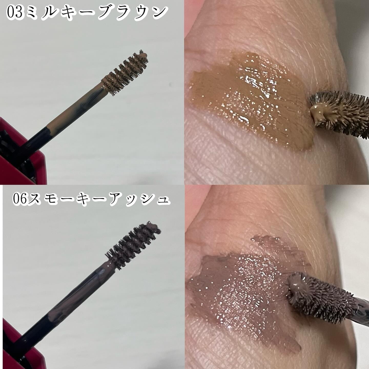 - カラーリング*1×スタイリング 瞬間毛流れセット、長時間つづく ①脱色したみたいにカラーリング*1 ひと塗りでスッとなじむアッシュが入った4色展開 どんな髪色にも似合って、あか抜けられる ②根元から自在にスタイリング 根元から立たせて固定するから、朝決めたスタイルがくずれにくい。 下がりがちな毛流れも整えたままロックしてキープ。 ③汗、水、こすれに強い なめらかなジェル処方だから整えた眉が長時間つづく! *1 メイクアップ効果。