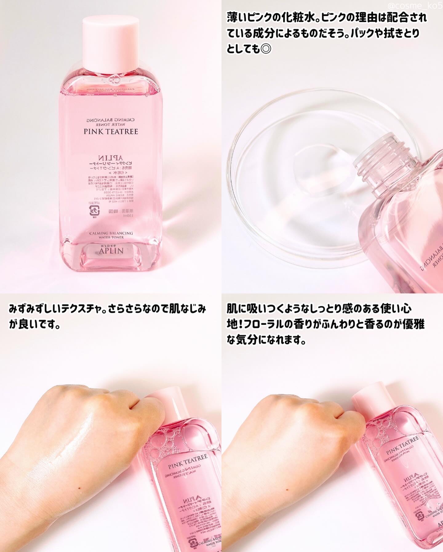 ティーツリーや、シカエキスを配合でニキビ、肌荒れ悩みをケアしてくれるトナー🩷 ピンク色は自然成分「ビタミンB12」本来の色だそう✨ サラサラテクスチャーで、さっぱりした使い心地✨