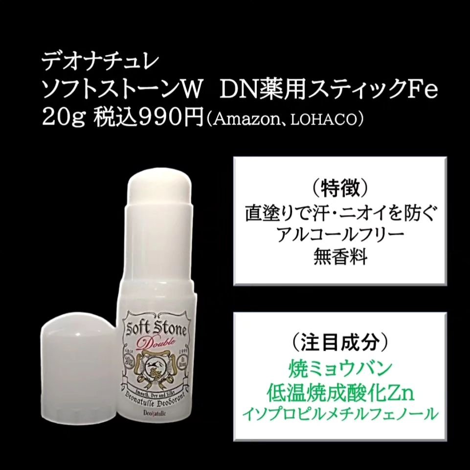 - \11年間ず~っと売上No.1*制汗デオドラント/ ワキの汗・ニオイを元から防ぐ 直ヌリスティック・無香料・アルコールフリー 天然アルム石に着目。有効成分「焼ミョウバン」を配合。 ◆◆ユーザーから選ばれる理由◆◆ ◆『天然アルム石のチカラ』に着目して、汗・ニオイを元から防ぐ! 「デオナチュレ ソフトストーンW」は、天然アルム石に着目。有効成分「焼ミョウバン」を配合し、汗・ニオイを元から防ぎます。 ◆ニオイの発生源・ワキに“直ヌリ”でしっかり密着し、朝ぬって夜まで続いちゃう! 忙しい朝でもサッとつけることができるスティックタイプで、夜まで長時間持続。 ◆すぐにサラサラ!ベタつき・白残りしにくい すぐに洋服を着ることができるので、時間のない朝にも嬉しい! ==注意== ●顔・粘膜を避け、除脱毛直後や肌に異常があるときは使用しないでください。●肌に異常が生じていないかよく注意してご使用ください。また、お肌に合わないとき、使用中に赤み、はれ、かゆみ、刺激、色抜け(白班等)や黒ずみ等の異常があらわれたときは、使用を中止し、皮フ科専門医などにご相談ください。●使用後はキャップをしっかり閉め、直射日光や高温多湿を避けて保管してください。●乳幼児の手の届かないところに置いてください。●スティックを出し過ぎて折れないようご注意ください。●衣類などにつかないようご注意ください。●本製品は残り少なくなりますと、構造上容器の底に中身が若干残ります。そのため、実際には容器に表記されております容量以上を充填しております。 販売名:DN薬用スティックFe *インテージSRI+制汗剤市場 2013年5月~2024年4月 ソフトストーンW(販売名:デオナチュレソフトストーンEX(リニューアル前処方)・DN薬用スティックFe)累計販売金額
