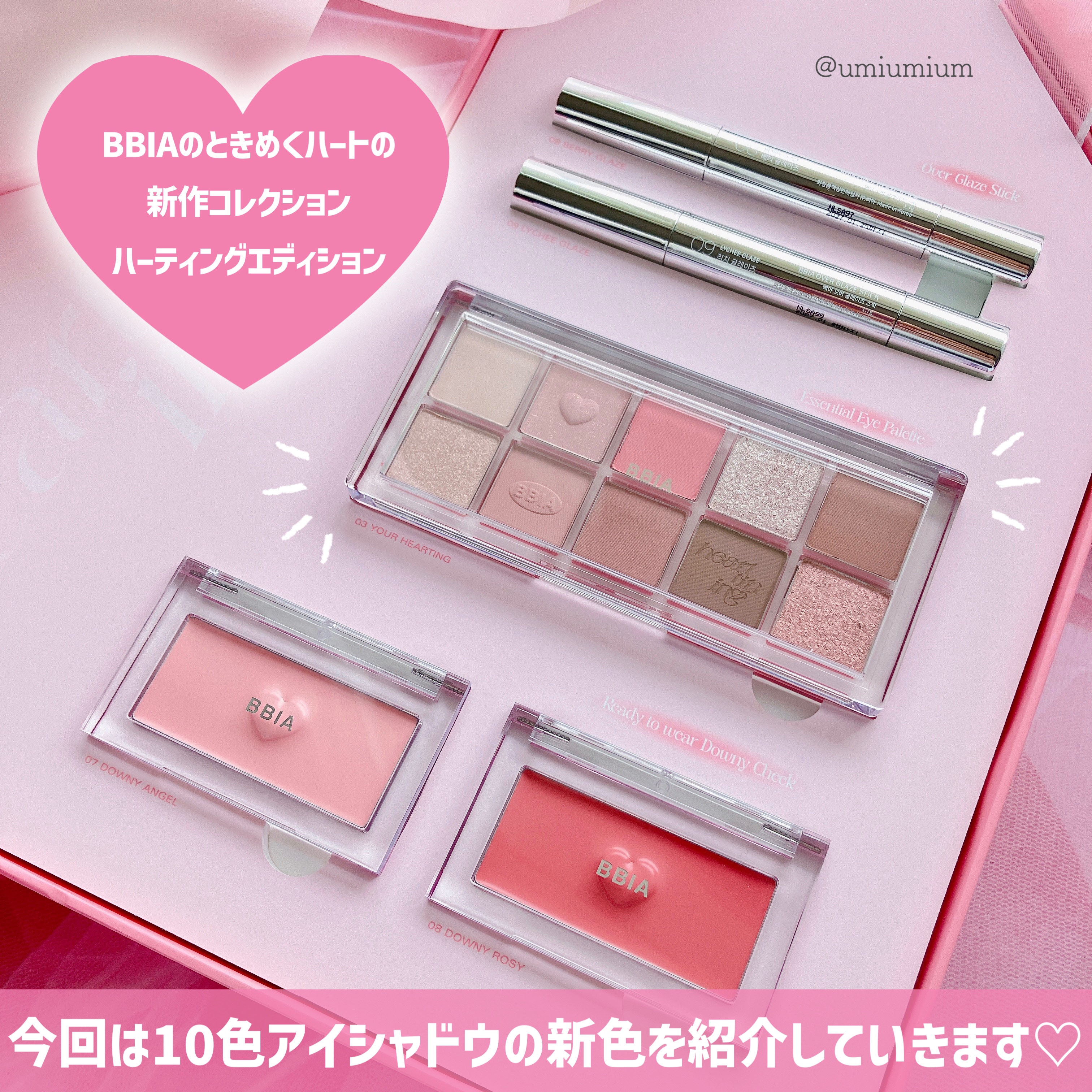 胸のときめく瞬間を込めたBBIAのhearting edition💗 自分だけのムードを演出するアイパレットでときめくアイメイクを楽しめます✨ マット・マットパール・グリッターの質感のシャドウで密着力とキープ力が高く、アイメイクの完成度を高めてくれます🫧 ❤︎03ユアーハーティング:血色感と鮮やかさを演出するロマンチックなロージーピンク🌹 ハート柄がとっても可愛くて、使うたびにテンションが上がります💞