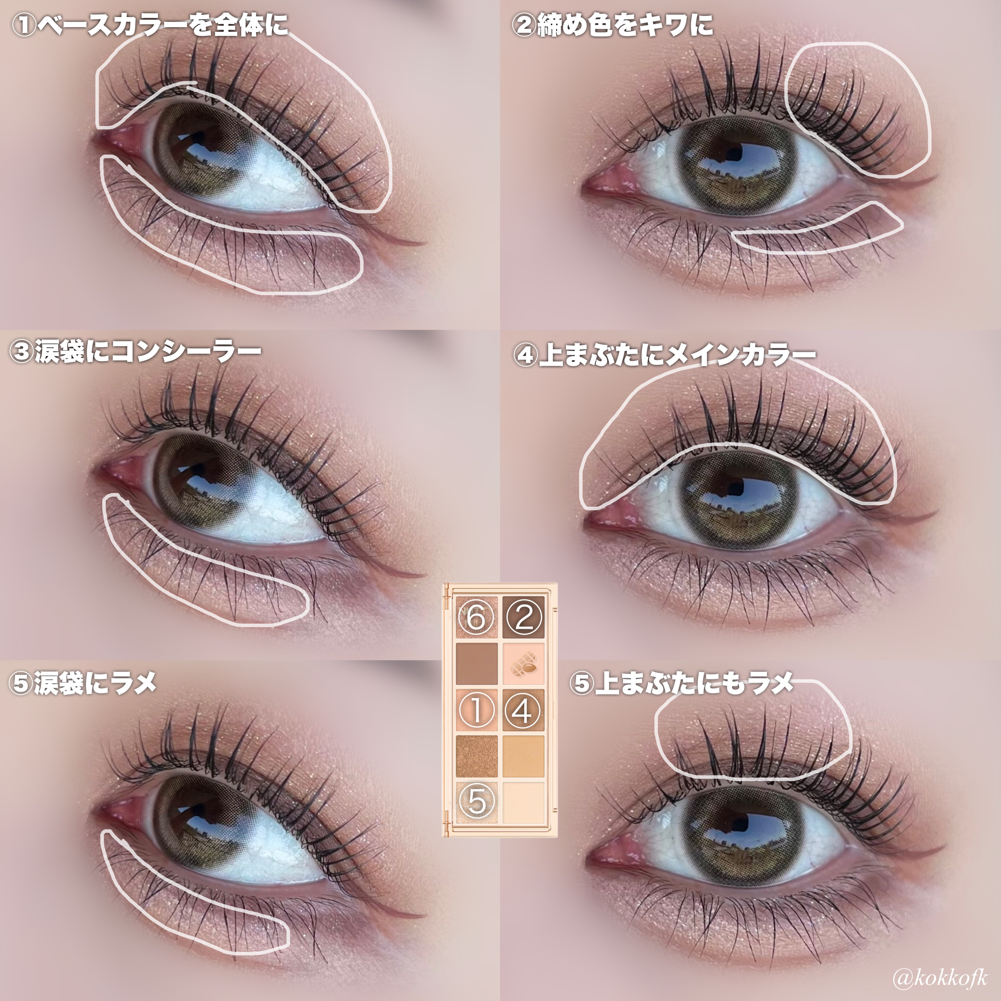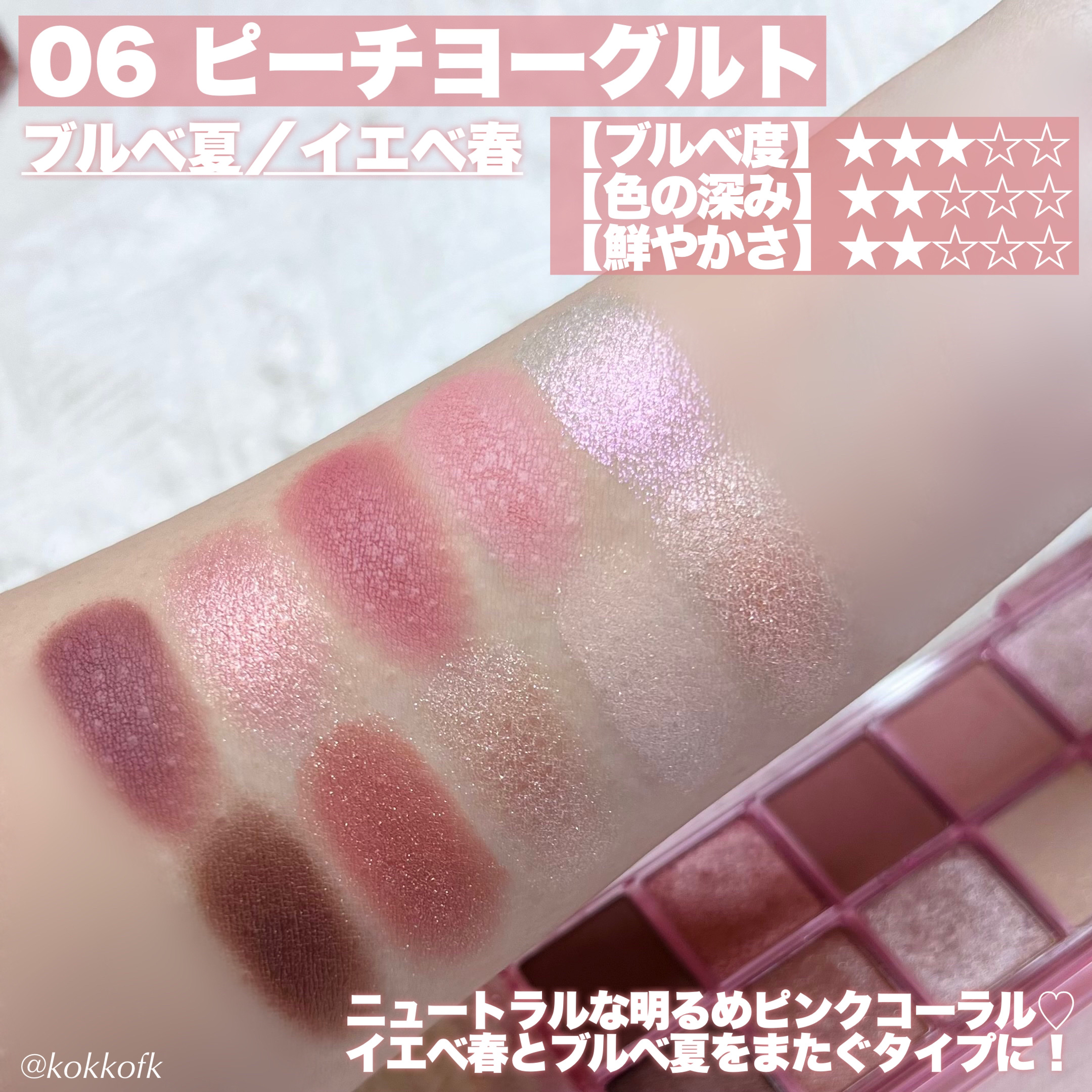 - 塗りやすいマットカラーから輝くグリッターまで揃ったパレット。 グラデーションに並べられたカラーを順番に塗るだけでデイリーメイクできます。 <POINT> ○一目でわかるカラーチュートリアル 締め色、中間色、ベースカラー、グリッターが順に並んだパレットで、組み合わせに迷うことなく気軽にアイメイクの配色をお楽しみいただけます。 ○パーソナルトーンに合わせた捨て色のないカラー構成 毎日使いたくなるデイリーカラーで、それぞれのパーソナルトーンに合わせて丁寧に仕立てられたラインナップ。 ○立体的なグリッターから密着タイプの陰影カラーまで 粉飛びやムラなくすっきり重ねられる陰影カラーから、多彩なグリッターで構成されたバリエーション豊かなパレット。このパレットひとつで手軽に幅広い印象の目元が演出できます。