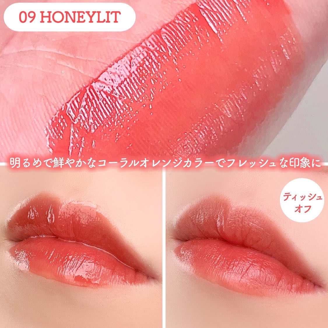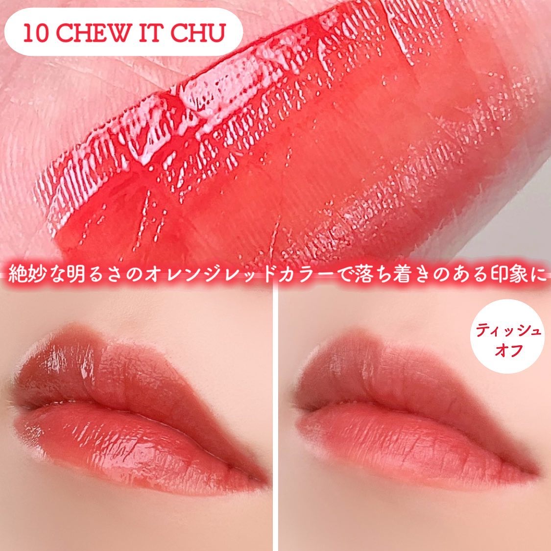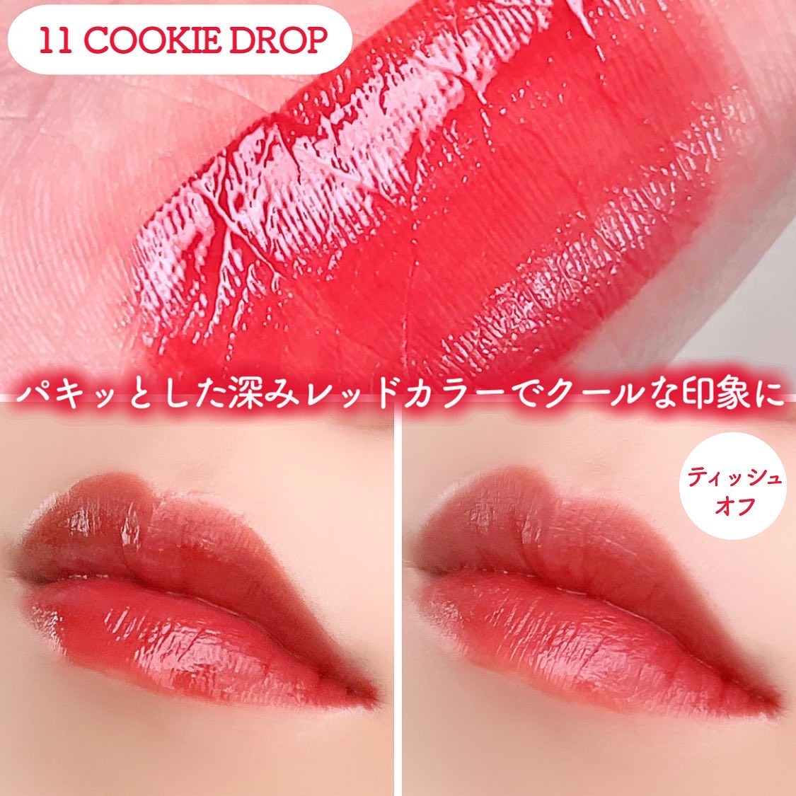 このリップは塗布後しばらくするとゲル層とシリコーン層の2層膜を形成!! ゲル層が唇にピタッと密着することで高いラスティング効果を実現し擦れに強く長時間色持ちをキープ!! そして塗布膜表面のシリコーン層が高い透明感と程よいツヤ感を演出してくれるんです😊 スルスルっと軽くなめらかな塗り心地で、唇にピタッと色が密着してくれている感じがすごいする✨ 1度塗りでも十分なくらい発色がとてもよく、ムラなく均一に綺麗に塗れるのがとても良き🙆♀️ 塗ってから60秒何もせずに待つと色持ちがUP!! 軽くティッシュオフしても色味が全然落ちないのが感動😭ツヤ感は落ちてしまうけど… 5種のオーガニック植物抽出成分を配合したり、アルコール等を使用してないので唇にも優しいので唇が荒れやすい方にもオススメです☺️