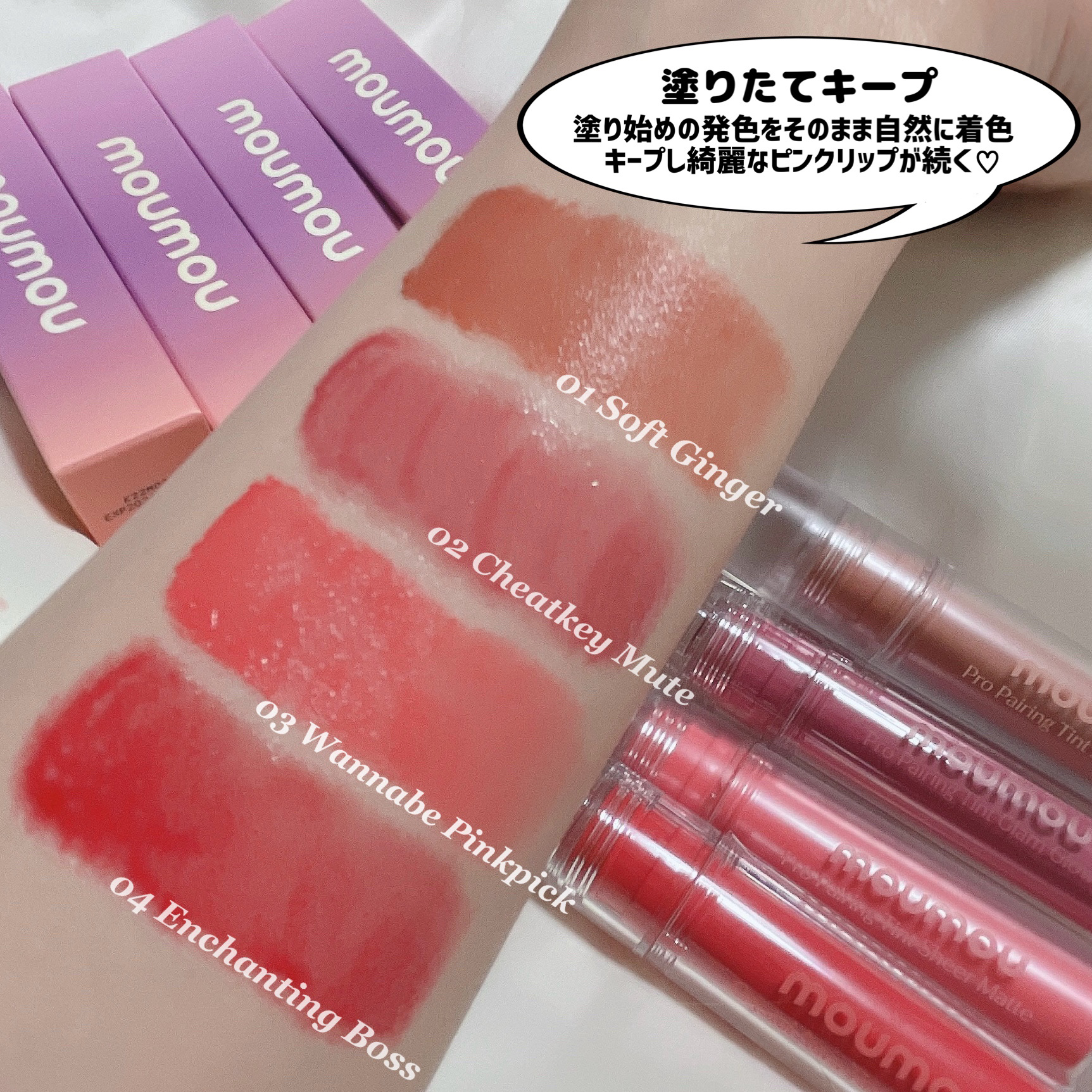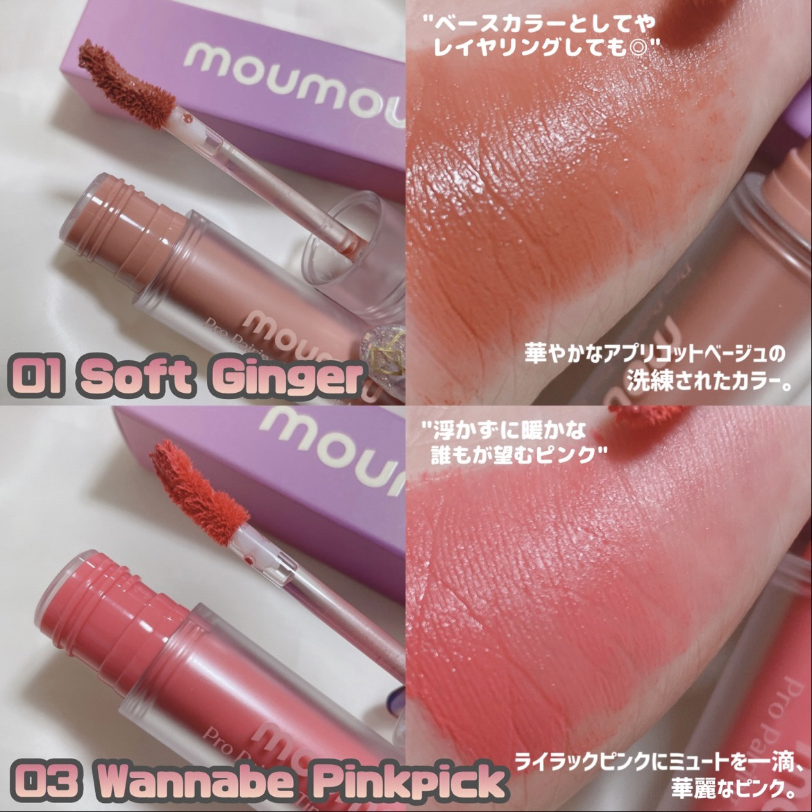 乾燥しないベースリップにも最適なティントmoumouプロペアリングティント01 SoftGingermoumouは韓国のメイクアップアーティストさん監修のブランドプロペアリングティントは、カラーによって質感が違うリップ今回購入した01はマット...