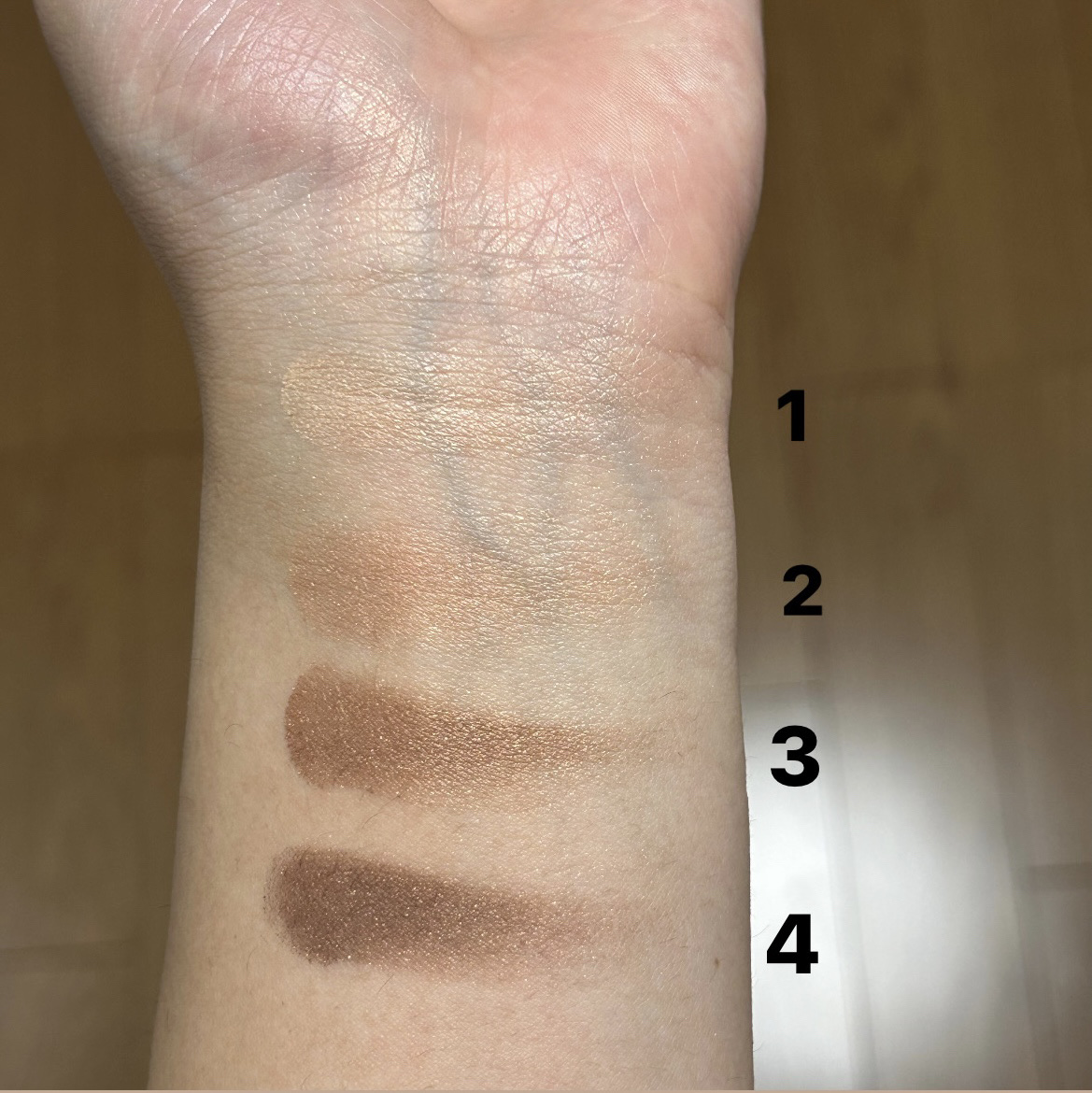 左上の薄いカラーはナチュラルに色ずくのでナチュラルメイクにも使えそうです! 右上の赤い色を混ぜれば赤みメイクもできるし、少し濃いめのメイクもできます!! 左下のラメはもう、、、🤤 白ベースで青色のラメが入っていて、青色より小さめのゴールドのラメが沢山入っていて、上の2色とよくあいます❣️ 右下のブラウンカラーは濃すぎず、使いやすいカラーで目尻を締めるのに使いました!