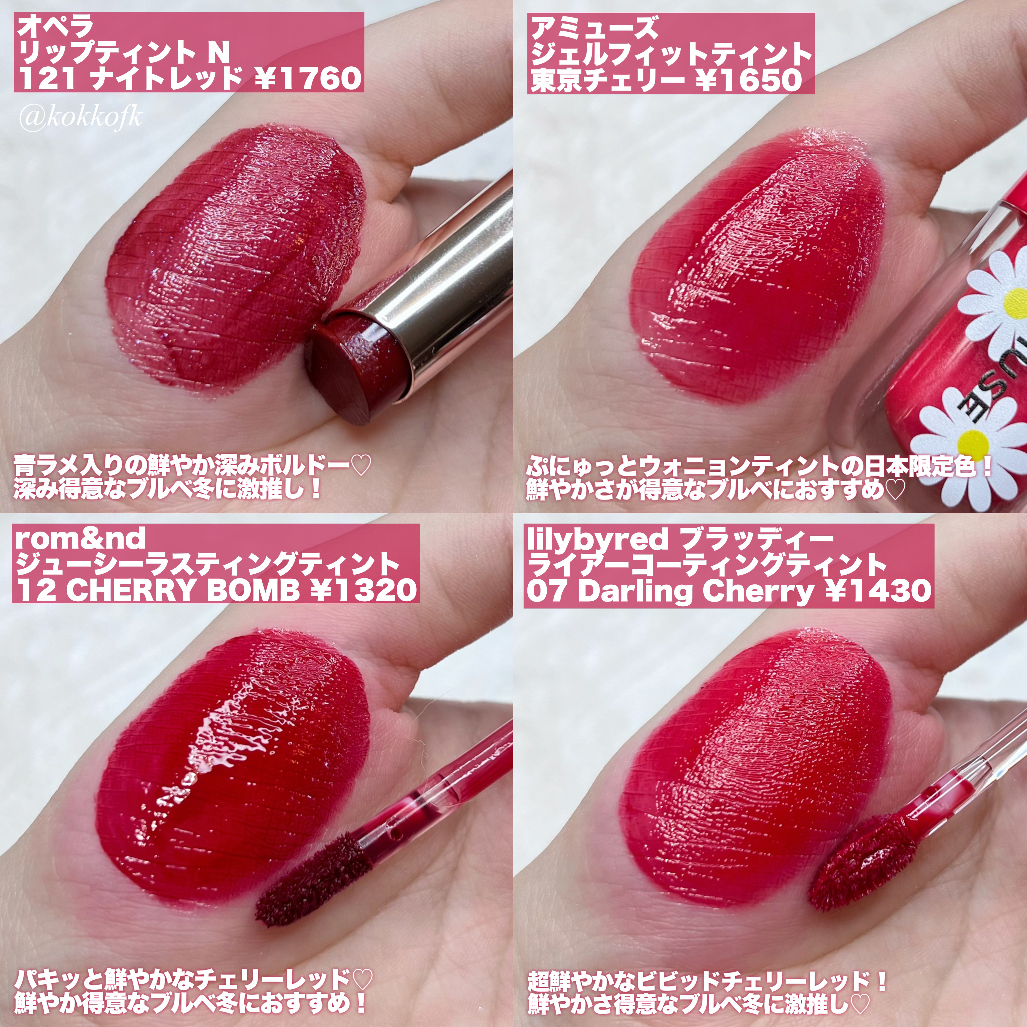 薄く唇に密着する新作マットティント。 マットなのにかなりしっとりとしていて 乾燥を感じなくてびっくりでした! 一気にこなれ感が出るトレンドカラーです♡ やや青みの華やかローズレッド 公式画像より鮮やかめに感じました。 やや黄みの強くて深いオレンジレッド ストロングオータムに超激推しです! やや黄みの非常に深く濃いダークブラウン ディープオータムに激推しです! かわいい雰囲気になれるピンクリップです♡ やや青みの柔らかいくすみピンクベージュ ミューテッドサマーにおすすめです! 青みの落ち着いたローズピンク やや青みのとても鮮やかなビビッドレッド ビビッドウィンターに特におすすめ! 既存マットティントよりもさらに ふわふわなマット感が魅力のリップで、 軽くティッシュオフしてもほとんど落ちない◎ マスクにも激推しのティントなので、 ぜひ皆さんもチェックしてみてね❤︎