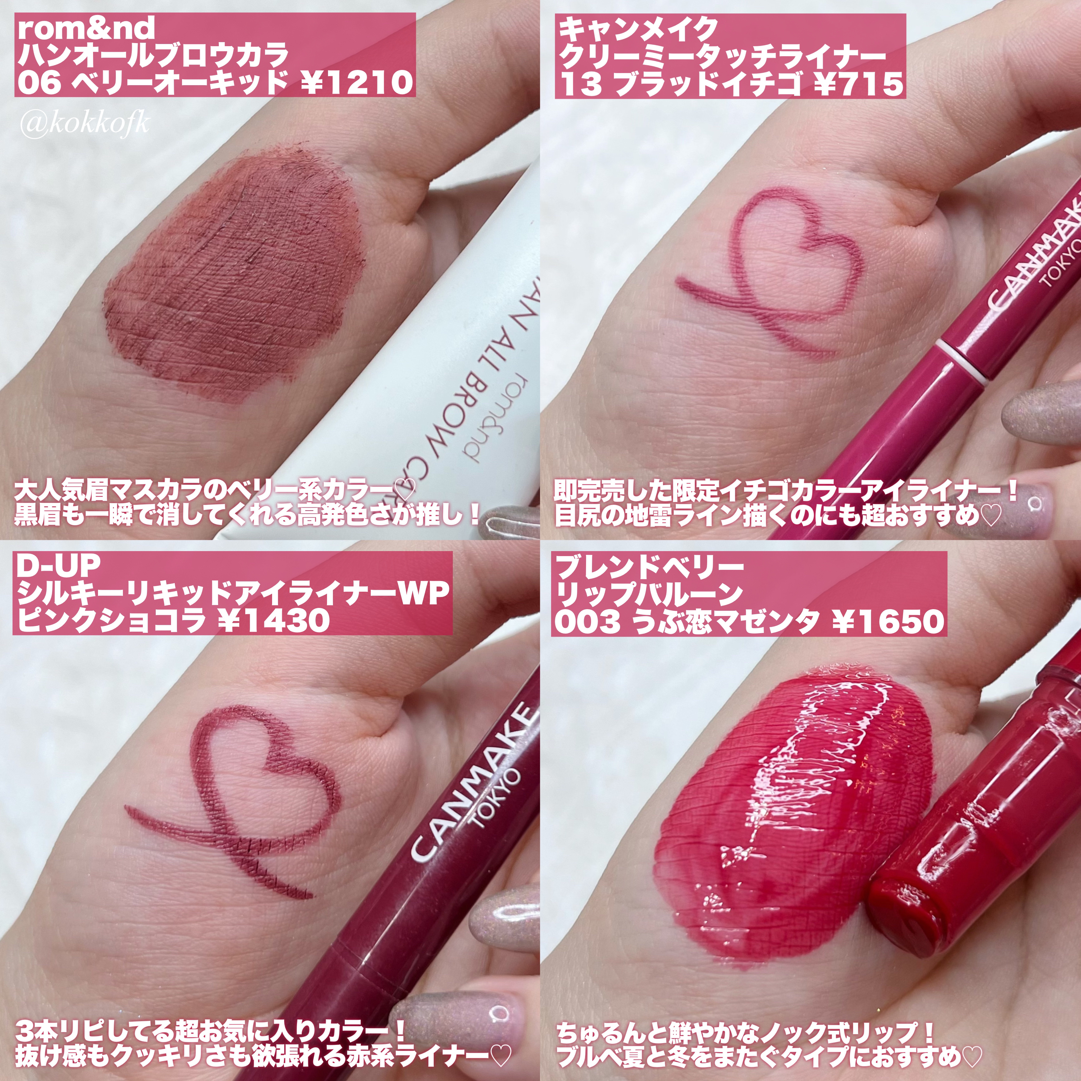 rom&nd────────────ベターザンパレット06 PEONY NUDE GARDEN (¥2900) rom&nd────────────ベターザンアイズ W03 Dry Strawberry (¥1569) HOLIKA HOLIKA────────────マイフェブムードアイパレットMOONY (¥2050) HOLIKA HOLIKA────────────マイフェブムードアイパレットPINK OLOGY (¥2050) CLIO────────────プロ アイ パレット13 PICNIC BY THE SUNSET (¥2390) PERIPERA────────────オール テイク ムード パレット04 MUTEFUL ROSE (¥1590) PERIPERA────────────オール テイク ムード パレット09 MOONLIKE LAVENDER PINK (¥1590) PERIPERA────────────インク ポケット シャドウ パレット05 TOUCHING TARO STARS (¥1190)