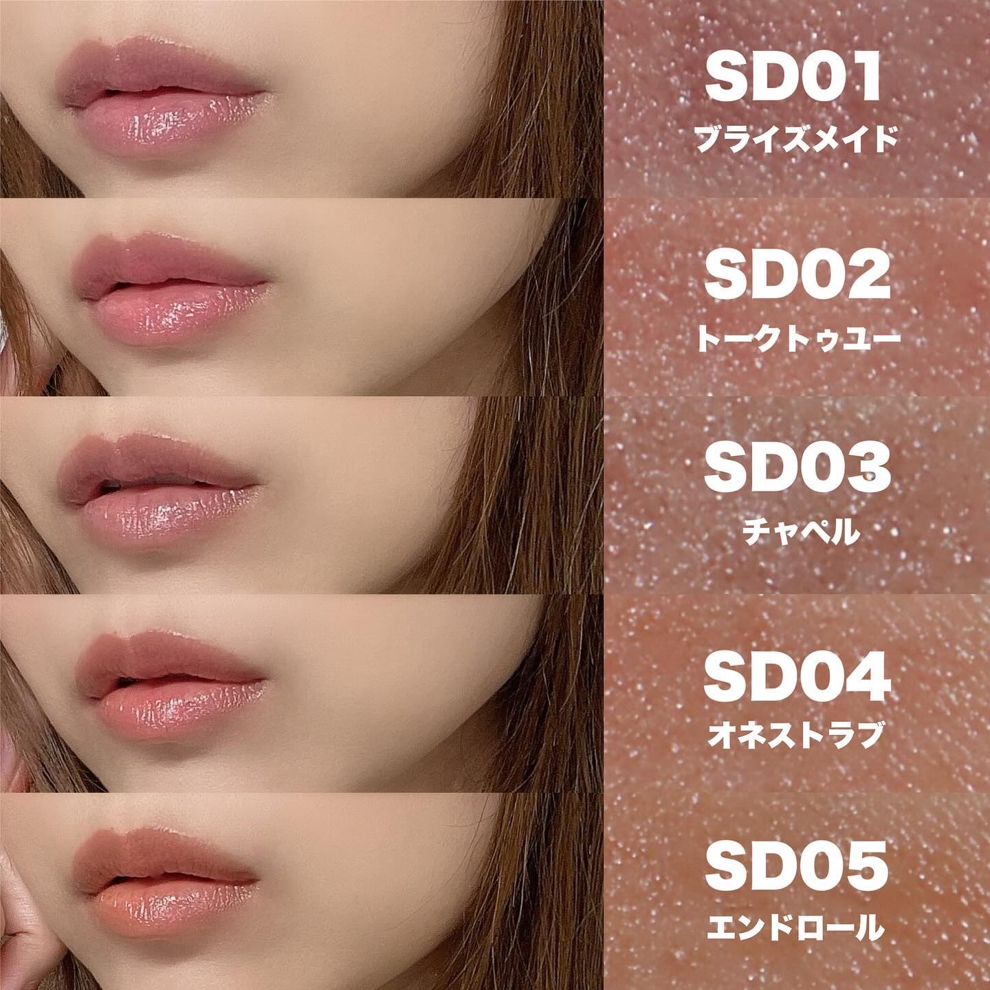 - <SD01 ブライズメイド> 水添ポリイソブテン、トリエチルヘキサノイン、ダイマージリノール酸ジ(イソステアリル/フィトステリル)、デカイソステアリン酸ポリグリセリル-10、トリメチルペンタフェニルトリシロキサン、合成ワックス、リンゴ酸ジイソステアリル、ジフェニルシロキシフェニルトリメチコン、ワセリン、トリメチルシロキシフェニルジメチコン、マイクロクリスタリンワックス、バニリルブチル、メントキシプロパンジオール、ヒアルロン酸クロスポリマーNa、加水分解コラーゲン、ホホバ種子油、オリーブ果実油、ブドウ種子油、マカデミア種子油、アボカド油、アルガニアスピノサ核油、カニナバラ果実油、アーモンド油、アンズ核油、メドウフォーム種子油、(ジイソステアリン酸/ポリヒドロキシステアリン酸/セバシン酸)ポリグリセリル-4、イソステアリン酸Na、カルナウバロウ、キャンデリラロウエステルズ、ステアリン酸エチルヘキシル、セスキイソステアリン酸ソルビタン、トコフェロール、ハイドロゲンジメチコン、ホウケイ酸(Ca/Al)、水、(+/-)シリカ、ラウロイルリシン、黄4、黄5、酸化チタン、酸化鉄、水酸化Al、青1、赤201、赤202 <SD02 トークトゥユー > 水添ポリイソブテン、トリエチルヘキサノイン、ダイマージリノール酸ジ(イソステアリル/フィトステリル)、デカイソステアリン酸ポリグリセリル-10、トリメチルペンタフェニルトリシロキサン、合成ワックス、リンゴ酸ジイソステアリル、ジフェニルシロキシフェニルトリメチコン、ワセリン、トリメチルシロキシフェニルジメチコン、マイクロクリスタリンワックス、バニリルブチル、メントキシプロパンジオール、ヒアルロン酸クロスポリマーNa、加水分解コラーゲン、ホホバ種子油、オリーブ果実油、ブドウ種子油、マカデミア種子油、アボカド油、アルガニアスピノサ核油、カニナバラ果実油、アーモンド油、アンズ核油、メドウフォーム種子油、(ジイソステアリン酸/ポリヒドロキシステアリン酸/セバシン酸)ポリグリセリル-4、イソステアリン酸Na、カルナウバロウ、キャンデリラロウエステルズ、ステアリン酸エチルヘキシル、セスキイソステアリン酸ソルビタン、トコフェロール、ハイドロゲンジメチコン、ホウケイ酸(Ca/Al)、水、(+/-)シリカ、ラウロイルリシン、黄4、黄5、酸化チタン、酸化鉄、水酸化Al、青1、赤201、赤202 <SD03 チャペル> 水添ポリイソブテン、トリエチルヘキサノイン、ダイマージリノール酸ジ(イソステアリル/フィトステリル)、デカイソステアリン酸ポリグリセリル-10、トリメチルペンタフェニルトリシロキサン、合成ワックス、リンゴ酸ジイソステアリル、ジフェニルシロキシフェニルトリメチコン、ワセリン、トリメチルシロキシフェニルジメチコン、マイクロクリスタリンワックス、バニリルブチル、メントキシプロパンジオール、ヒアルロン酸クロスポリマーNa、加水分解コラーゲン、ホホバ種子油、オリーブ果実油、ブドウ種子油、マカデミア種子油、アボカド油、アルガニアスピノサ核油、カニナバラ果実油、アーモンド油、アンズ核油、メドウフォーム種子油、(ジイソステアリン酸/ポリヒドロキシステアリン酸/セバシン酸)ポリグリセリル-4、イソステアリン酸Na、カルナウバロウ、キャンデリラロウエステルズ、ステアリン酸エチルヘキシル、セスキイソステアリン酸ソルビタン、トコフェロール、ハイドロゲンジメチコン、ホウケイ酸(Ca/Al)、水、(+/-)シリカ、ラウロイルリシン、黄4、黄5、酸化チタン、酸化鉄、水酸化Al、青1、赤201、赤202 <SD04 オネストラブ> 水添ポリイソブテン、トリエチルヘキサノイン、ダイマージリノール酸ジ(イソステアリル/フィトステリル)、デカイソステアリン酸ポリグリセリル-10、トリメチルペンタフェニルトリシロキサン、合成ワックス、リンゴ酸ジイソステアリル、ジフェニルシロキシフェニルトリメチコン、ワセリン、トリメチルシロキシフェニルジメチコン、マイクロクリスタリンワックス、バニリルブチル、メントキシプロパンジオール、ヒアルロン酸クロスポリマーNa、加水分解コラーゲン、ホホバ種子油、オリーブ果実油、ブドウ種子油、マカデミア種子油、アボカド油、アルガニアスピノサ核油、カニナバラ果実油、アーモンド油、アンズ核油、メドウフォーム種子油、(ジイソステアリン酸/ポリヒドロキシステアリン酸/セバシン酸)ポリグリセリル-4、イソステアリン酸Na、カルナウバロウ、キャンデリラロウエステルズ、ステアリン酸エチルヘキシル、セスキイソステアリン酸ソルビタン、トコフェロール、ハイドロゲンジメチコン、ホウケイ酸(Ca/Al)、水、(+/-)シリカ、ラウロイルリシン、黄4、黄5、酸化チタン、酸化鉄、水酸化Al、青1、赤201、赤202 <SD05 エンドロール> 水添ポリイソブテン、トリエチルヘキサノイン、ダイマージリノール酸ジ(イソステアリル/フィトステリル)、デカイソステアリン酸ポリグリセリル-10、トリメチルペンタフェニルトリシロキサ