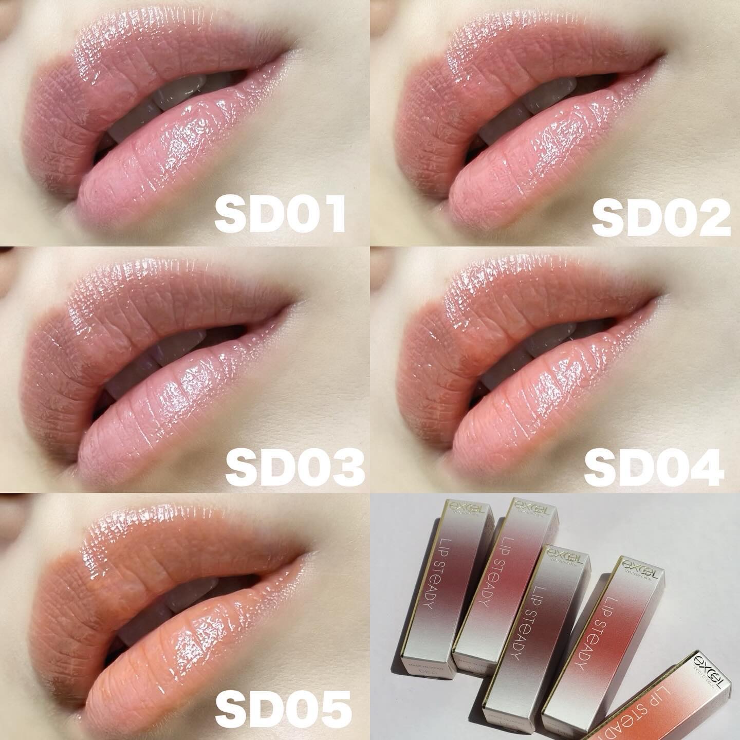 @excelmakeリップステディ全5色今回はブルベよりの3色をGET🩷SD01ブライズメイドサマーソフトおススメ少しトーン暗めのローズベージュSD02トークトゥユーサマーライトおススメ公式にはピーチベージュとあったけどそんなに黄味感は感じな...