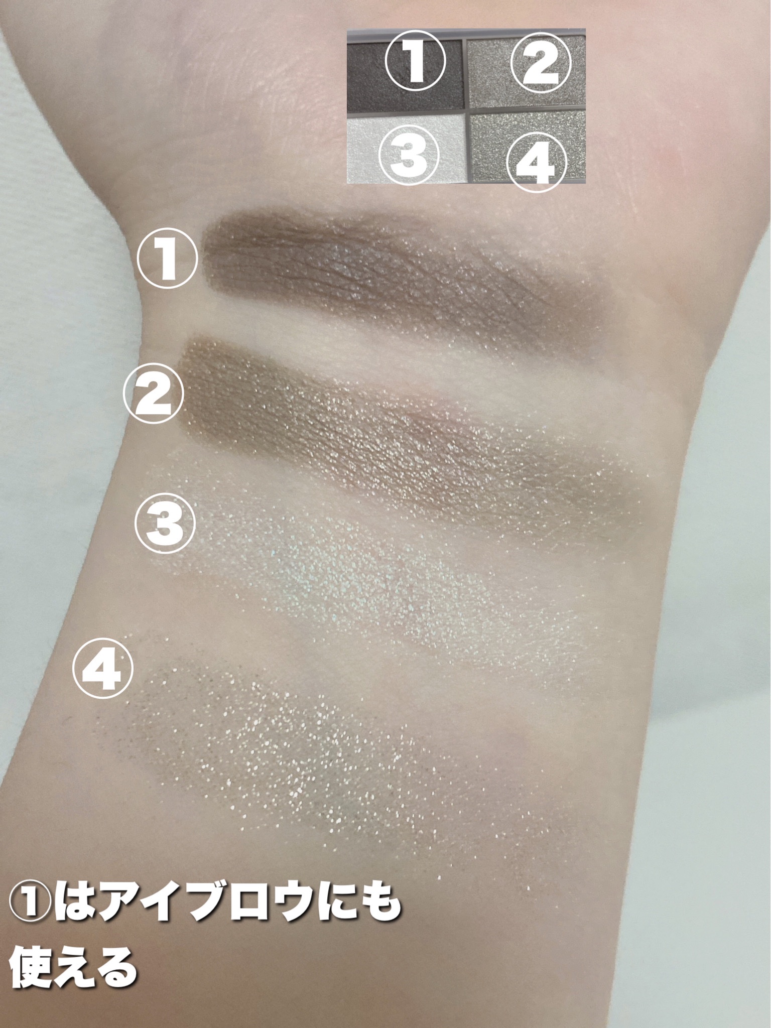 ほんのりブラウンみががっているので、馴染みやすく使いやすいです✨️ ナチュラルにちょっぴりモード系の大人っぽい目元を作れます🌟 繊細ラメも美しく、ホワイトにはグリーンのラメが散りばめられていて、周りの色と上手く調和が取れる色合いになっています✨️