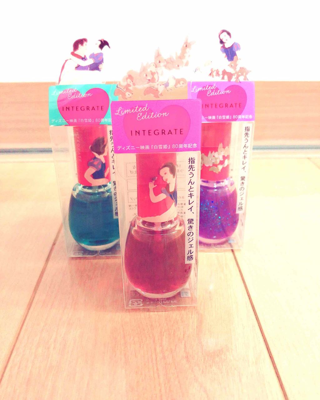 インテグレートのジェルドロップネール💅白雪姫コラボのがあまりにも綺麗で買ってしまいました青紫色の液に小さいホログラムがたくさん入ってます、飾るだけでも美しい🎆塗った感想としても非常によいです重めの液だけど乾きがすごく早い、透明なのでムラにもな...
