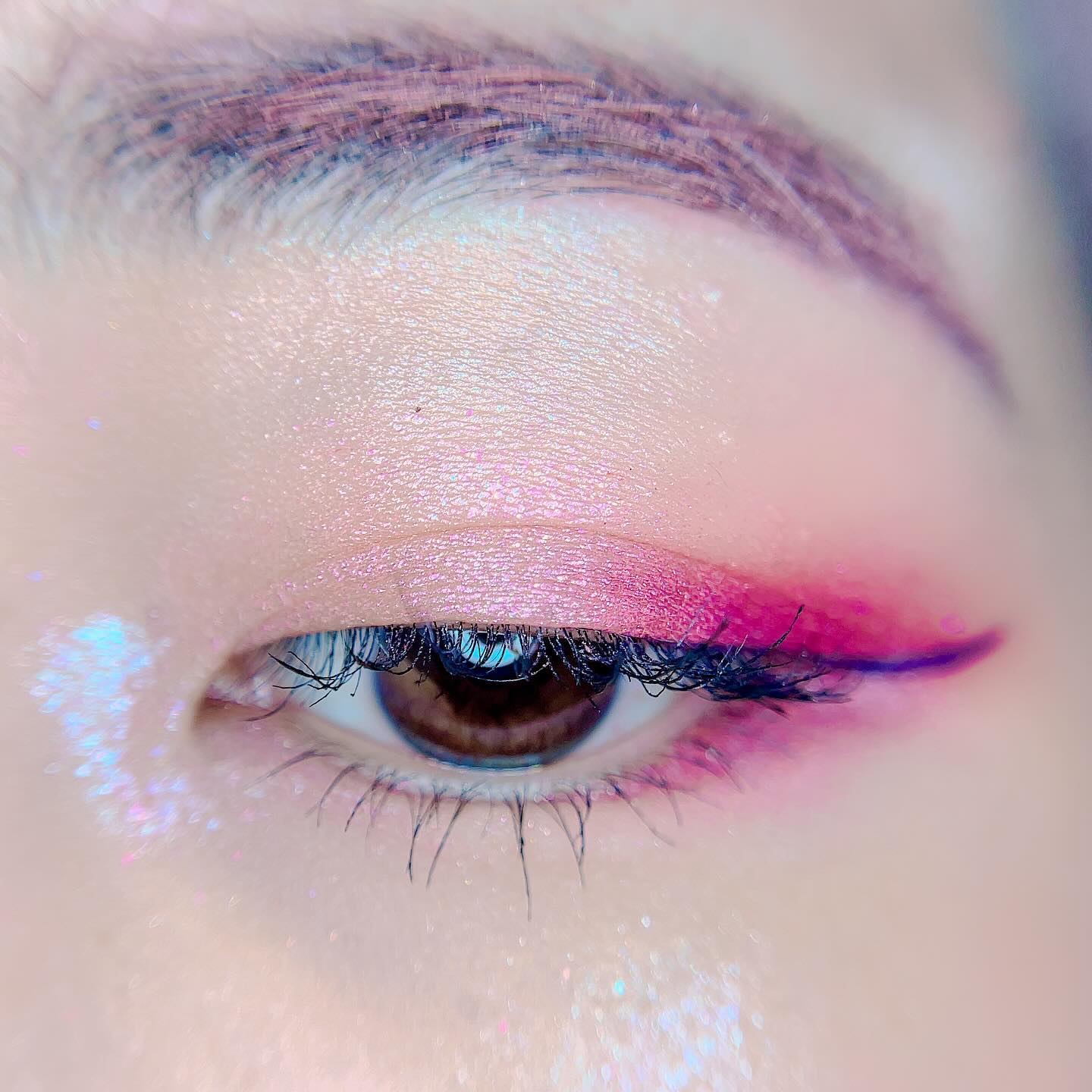 ピンクにグレージュも良いですね👌💗 今日は可愛らしい感じにしてみました💕 上下瞼黒目〜目頭側にラメを塗ってキラキラさせております🤩 目尻はマットのピンクを濃いめに重ねて💗 グレージュのアイライナーと相性◎