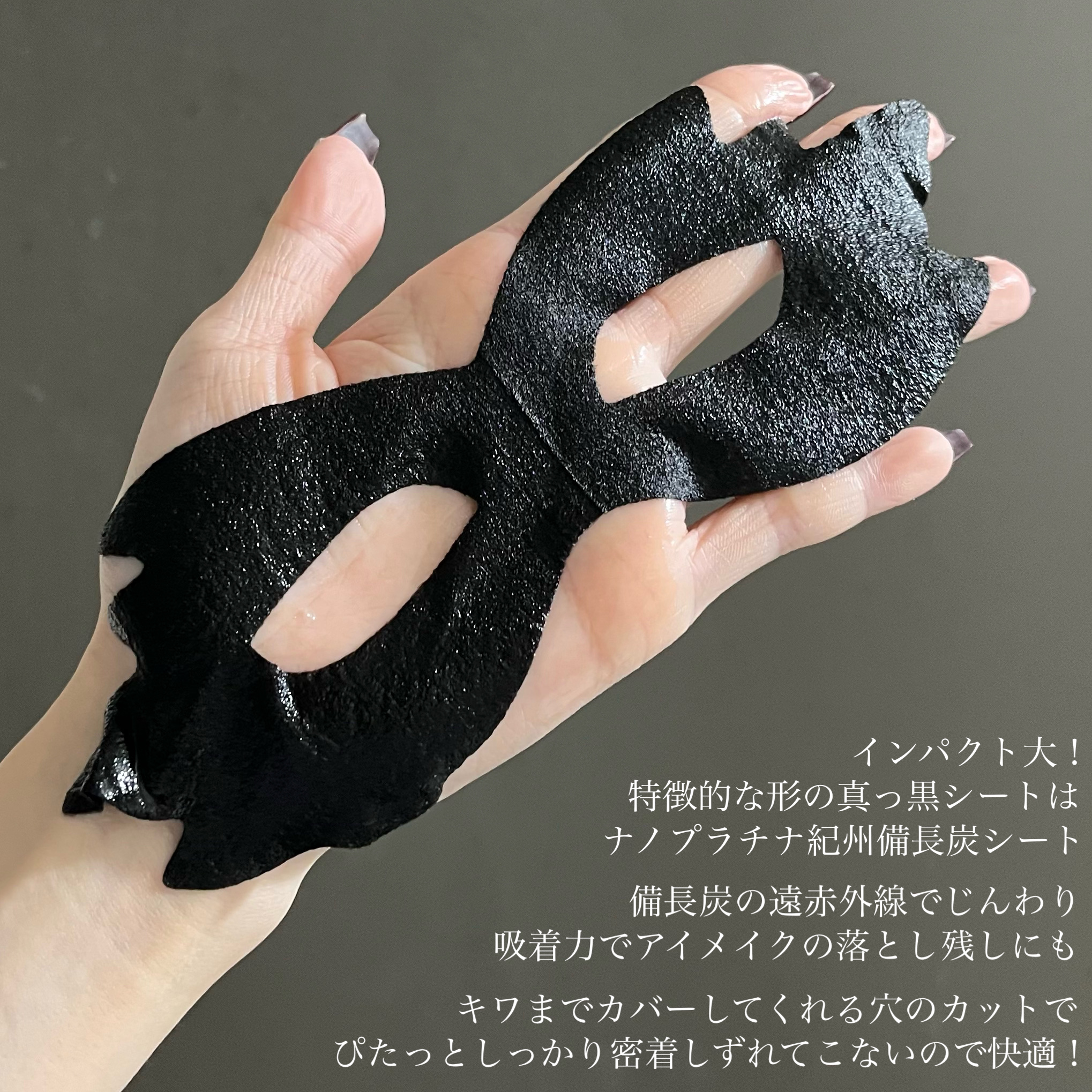 - 浄化と吸着性に優れた紀州備長炭繊維シートにナノプラチナ繊維を練り込んだ独自の「ナノプラチナ紀州備長炭シート」を使用した目元用マスク。 目元の肌にハリと弾力を与え、美肌に導きます。さらに注目美容保湿成分ナイアシンアミド、3種類のペプチドを配合することで透明感、ツヤと輝きを肌に与えます。 目元用マスクでハリとうるおいのある目元に。