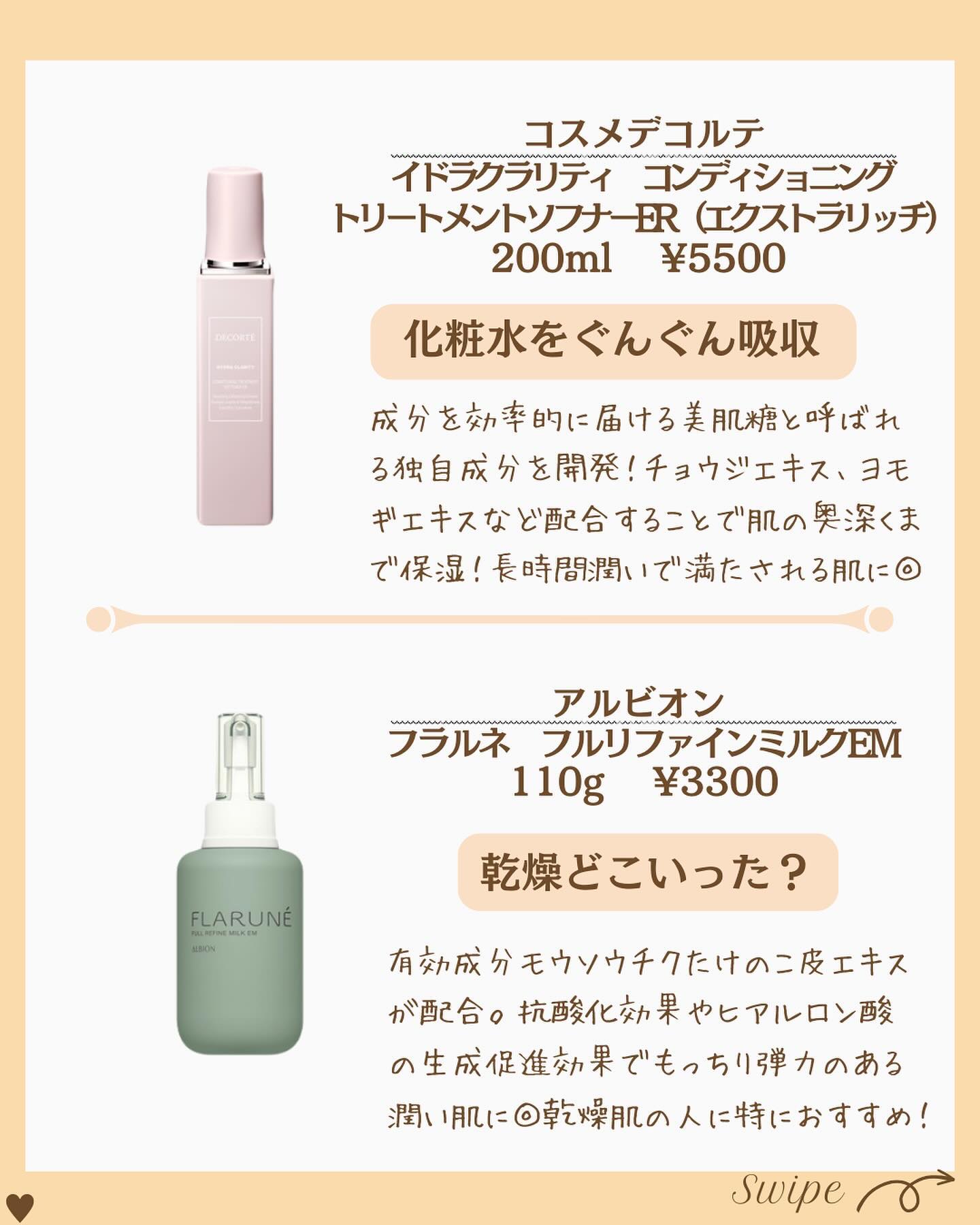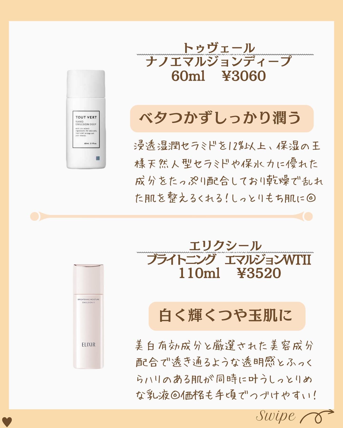 『即買い決定👍❣️ツヤ肌すぎてすっぴん綺麗言われた🥹💓』 →他の投稿はこちらから▷▷▷@tsuyako__beauty 素肌が武器となる🫧✨成分も最強な乳液を紹介するよーˎˊ˗ 私皮脂多いから春から秋にかけては乳液塗ってないの〜 って方たまにいます。 これはNGです🙅‍♀️ 保湿は全肌さん必要なので、潤いを閉じ込める役目の乳液は必ず毎日使って、せっかく浸透させた化粧水を蒸発させないように、しっかりフタをして潤いを保ちましょう♡ そうすることで肌人生変わります!! びっくりするほどに…☺️ 角質も柔らかくしてくれるから、日々のスキンケアの浸透が劇的に変わること間違いない👍🔥 綺麗になって自分をもっと好きになろっ🩶 保存しておくと、すぐに見返すことができて便利だよ🌟 そしてお気に入りが見つかると嬉しい💞 実際にどれが良かったか、コメントやDMで教えてね🩶 ①ドクターケイ  薬用Cリンクルホワイトミルク  70ml ¥8800   ②カルテ  カルテHDモイスチュア  フェイス&ボディローション 8g ¥1320   ③コスメデコルテ  イドラクラリティ コンディショニング  トリートメントソフナーER(エクストラリッチ)  200ml ¥5500   ④アルビオン フラルネ フルリファインミルクEM  110g ¥3300   ⑤エリクシール  ブライトニング デーケア  レボリューションWT+  35ml ¥3410 ⑥KINS  KINS MILK  30g ¥3480 ⑦トゥヴェール  ナノエマルジョンディープ 60ml ¥3060 ⑧エリクシール  ブライトニング エマルジョン  110ml ¥3520 ⑨エリクシール  リフトモイスト エマルジョンSPⅡ 130ml ¥3850   ⑩コスメデコルテ  AQアブソリュート エマルジョン  マイクロラディアンスⅡ  200ml ¥10450   金額は参考まで💁‍♀️ 𓂃𓂃𓂃𓂃𓂃𓂃𓂃𓂃𓂃𓂃𓂃𓂃𓂃𓂃𓂃𓂃 ダントツな美肌になれるˎˊ˗ 40代元美容部員が、お金をかけなくてもキレイになりたいを応援する40代元美容部員の情報発信部屋💁‍♀️  ̄ ̄ ̄ ̄ ̄ ̄ ̄ ̄ 他の投稿はこちらから ▷▷▷@tsuyako__beauty  ̄ ̄ ̄ ̄ ̄ ̄ ̄ ̄ ✳︎いいね・フォローありがとうございます✨ 美肌になる為に1番大事なこと!! それはズバリ『紫外線対策』だと思います💡 スキンケアと同時進行で365日日傘持ち歩きましょー♡ 日焼け止め+日傘で肌は劇的に変わるよ🥰 参考になる👀キレイをつくるための最新コスメ💄や美容情報🫧✨を毎日紹介しています♡ フォローは▷@tsuyako__beauty いいねとフォローお待ちしてます💁‍♀️ˎˊ˗ 𓂃𓂃𓂃𓂃𓂃𓂃𓂃𓂃𓂃𓂃𓂃𓂃𓂃𓂃𓂃𓂃 #美白ケア#肌ケア#保湿ケア#美肌効果#トーンアップ#乳液おすすめ #乳液推薦 #美肌効果あり #美肌になりたい人と繋がりたい #美肌になる #ツヤ肌コスメ #ノーメイク#素肌美人めざそう #素肌美人めざそう#肌きれい