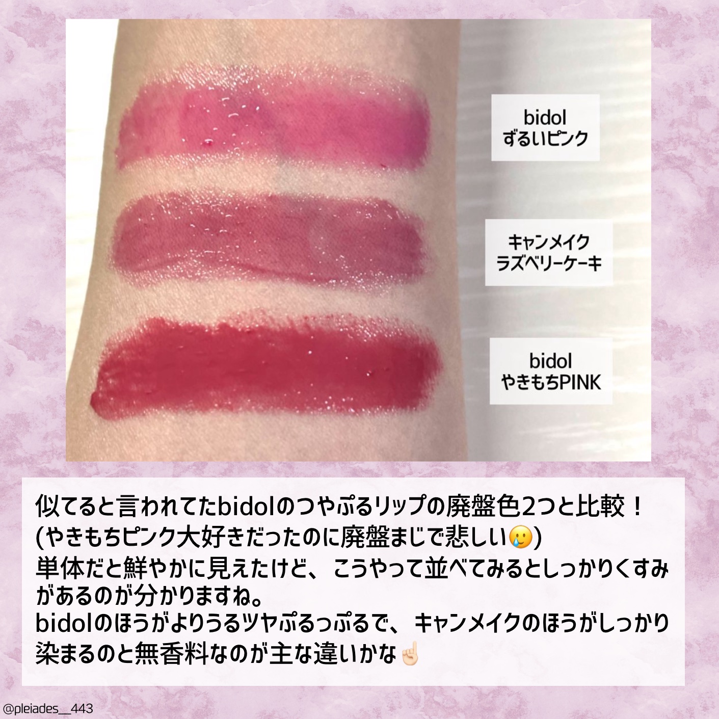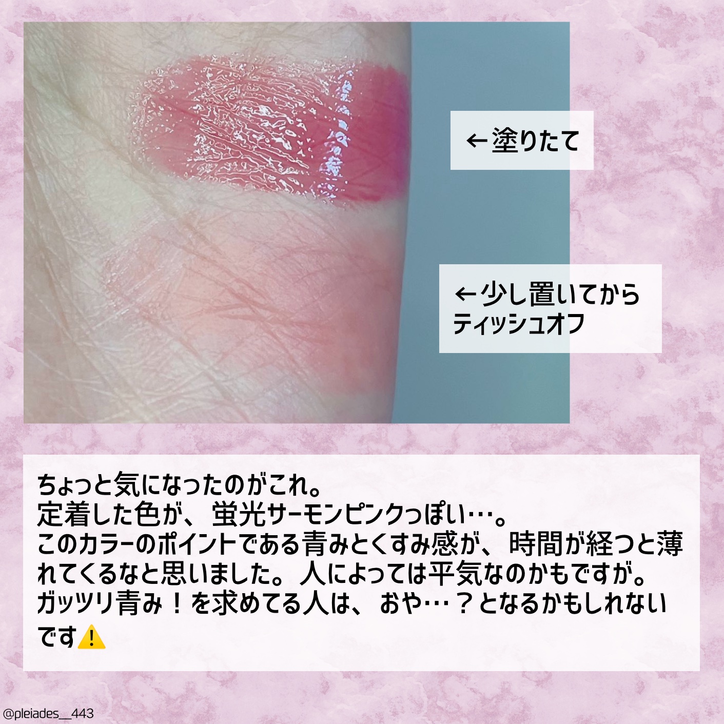塗ってみたら素の唇とほぼ同じ色でこれぞ粘膜色って感じ! でもちゃんとメイクしてる感が出るので薄くはならずとても良い。 保湿感などの使い心地は本当に好きだし、小さいから持ち運びしやすくて良いんだけど………ここまで色が変わるとなると、ちょっと使うタイミング困る💦 こちら定番色の1~3は #ブルベ 向けっぽく書かれてるけど、これはブルベさんには厳しいだろうなと思います😢