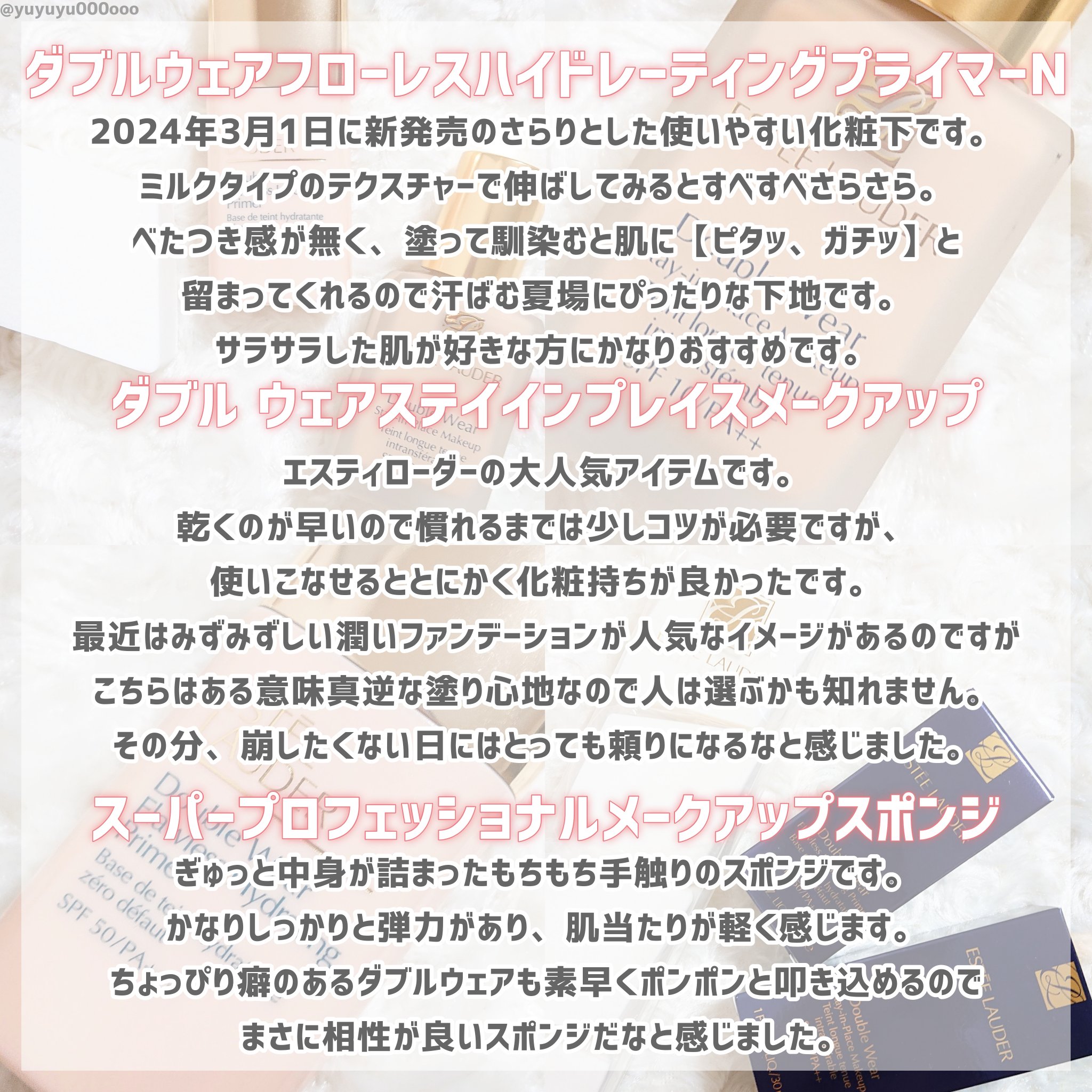 崩れにくいファンデーションで支持がある、エスティローダーのベースメイク。ファンデーションはアットコスメでも殿堂入り👑 高保湿なのが特徴で、しっとりした付け心地。それなのにテクスチャーはみずみずしいです🫧 なにより崩れにくい!支持率を集めるファンデーションなだけあると本当に強く思いました🙂↕️👑