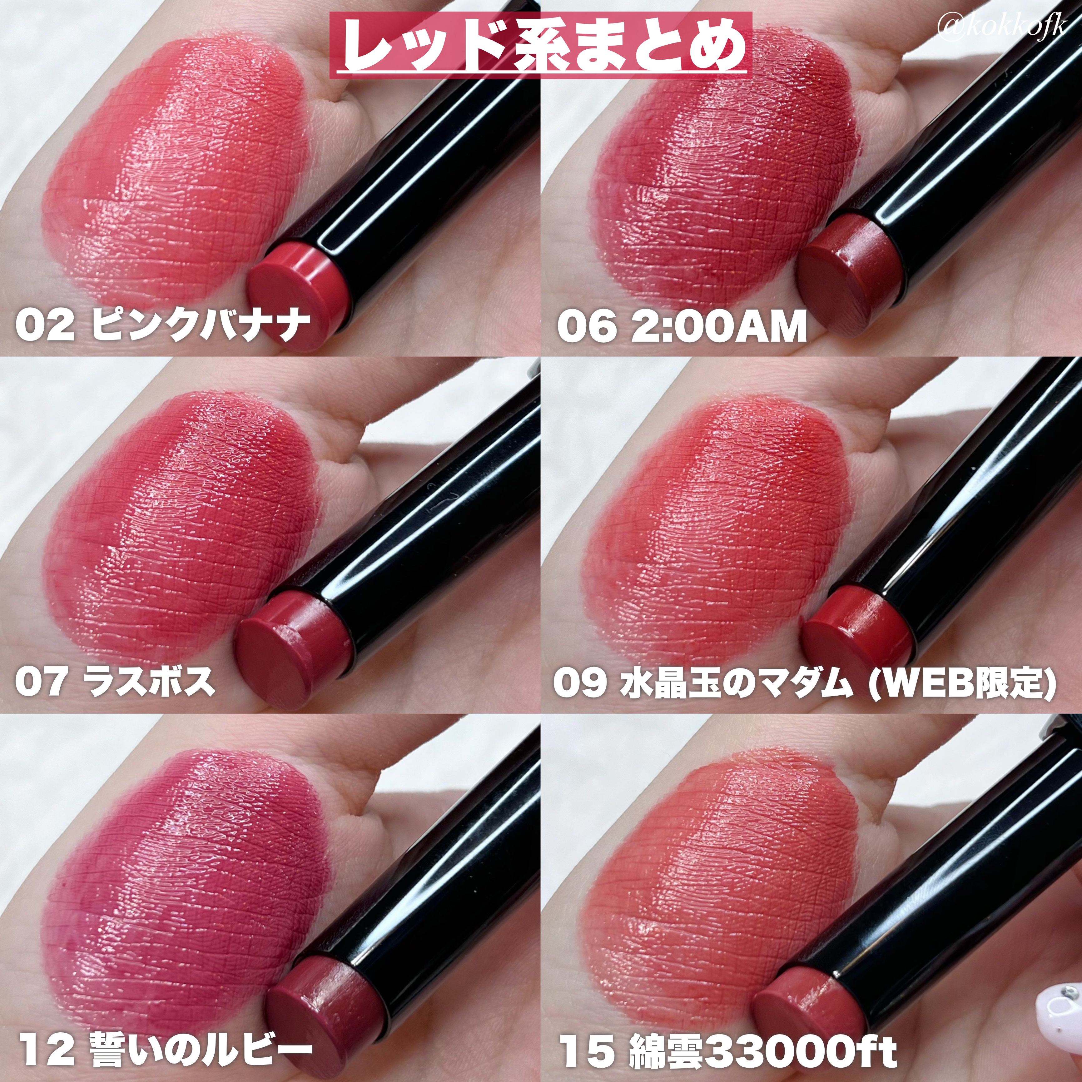 - <01 欲望の塊> テトライソステアリン酸ジペンタエリスリチル、トリ(カプリル酸/カプリン酸)グリセリル、オクチルドデカノール、ラウロイルグルタミン酸ジ(フィトステリル/オクチルドデシル)、ビスアルキル(C16-18)グリセリルウンデシルジメチコン、イソノナン酸イソトリデシル、水添ポリイソブテン、ラウロイルグルタミン酸ジ(オクチルドデシル/フィトステリル/ベヘニル)、パラフィン、合成ワックス、ダイマージリノール酸(フィトステリル/イソステアリル/セチル/ステアリル/ベヘニル)、マイクロクリスタリンワックス、水添マイクロクリスタリンワックス、ヒドロキシステアリン酸エチルヘキシル、トコフェロール、ホホバ種子油、オリーブ果実油、アーモンド油、(エチレン/プロピレン)コポリマー、ポリエチレン、ジメチコン、(+/-)(チタン/酸化チタン)焼結物、マイカ、ラウロイルアスパラギン酸Na、ラウロイルリシン、塩化亜鉛、酸化チタン、酸化鉄、水酸化Al、硫酸Ba、トリイソステアリン酸イソプロピルチタン、酸化スズ、ホウケイ酸(Ca/Al)、合成フルオロフロゴパイト、黄4、黄5、赤104(1)、赤201、赤202 <02 ピンクバナナ> テトライソステアリン酸ジペンタエリスリチル、トリ(カプリル酸/カプリン酸)グリセリル、オクチルドデカノール、ラウロイルグルタミン酸ジ(フィトステリル/オクチルドデシル)、ビスアルキル(C16-18)グリセリルウンデシルジメチコン、イソノナン酸イソトリデシル、水添ポリイソブテン、ラウロイルグルタミン酸ジ(オクチルドデシル/フィトステリル/ベヘニル)、パラフィン、合成ワックス、ダイマージリノール酸(フィトステリル/イソステアリル/セチル/ステアリル/ベヘニル)、マイクロクリスタリンワックス、水添マイクロクリスタリンワックス、ヒドロキシステアリン酸エチルヘキシル、トコフェロール、ホホバ種子油、オリーブ果実油、アーモンド油、(エチレン/プロピレン)コポリマー、ポリエチレン、ジメチコン、(+/-)(チタン/酸化チタン)焼結物、マイカ、ラウロイルアスパラギン酸Na、ラウロイルリシン、塩化亜鉛、酸化チタン、酸化鉄、水酸化Al、硫酸Ba、トリイソステアリン酸イソプロピルチタン、酸化スズ、ホウケイ酸(Ca/Al)、合成フルオロフロゴパイト、黄4、黄5、赤104(1)、赤201、赤202 <03 陽炎> テトライソステアリン酸ジペンタエリスリチル、トリ(カプリル酸/カプリン酸)グリセリル、オクチルドデカノール、ラウロイルグルタミン酸ジ(フィトステリル/オクチルドデシル)、ビスアルキル(C16-18)グリセリルウンデシルジメチコン、イソノナン酸イソトリデシル、水添ポリイソブテン、ラウロイルグルタミン酸ジ(オクチルドデシル/フィトステリル/ベヘニル)、パラフィン、合成ワックス、ダイマージリノール酸(フィトステリル/イソステアリル/セチル/ステアリル/ベヘニル)、マイクロクリスタリンワックス、水添マイクロクリスタリンワックス、ヒドロキシステアリン酸エチルヘキシル、トコフェロール、ホホバ種子油、オリーブ果実油、アーモンド油、(エチレン/プロピレン)コポリマー、ポリエチレン、ジメチコン、(+/-)(チタン/酸化チタン)焼結物、マイカ、ラウロイルアスパラギン酸Na、ラウロイルリシン、塩化亜鉛、酸化チタン、酸化鉄、水酸化Al、硫酸Ba、トリイソステアリン酸イソプロピルチタン、酸化スズ、ホウケイ酸(Ca/Al)、合成フルオロフロゴパイト、黄4、黄5、赤104(1)、赤201、赤202 <04 パンプキンワイン> テトライソステアリン酸ジペンタエリスリチル、トリ(カプリル酸/カプリン酸)グリセリル、オクチルドデカノール、ラウロイルグルタミン酸ジ(フィトステリル/オクチルドデシル)、ビスアルキル(C16-18)グリセリルウンデシルジメチコン、イソノナン酸イソトリデシル、水添ポリイソブテン、ラウロイルグルタミン酸ジ(オクチルドデシル/フィトステリル/ベヘニル)、パラフィン、合成ワックス、ダイマージリノール酸(フィトステリル/イソステアリル/セチル/ステアリル/ベヘニル)、マイクロクリスタリンワックス、水添マイクロクリスタリンワックス、ヒドロキシステアリン酸エチルヘキシル、トコフェロール、ホホバ種子油、オリーブ果実油、アーモンド油、(エチレン/プロピレン)コポリマー、ポリエチレン、ジメチコン、(+/-)(チタン/酸化チタン)焼結物、マイカ、ラウロイルアスパラギン酸Na、ラウロイルリシン、塩化亜鉛、酸化チタン、酸化鉄、水酸化Al、硫酸Ba、トリイソステアリン酸イソプロピルチタン、酸化スズ、ホウケイ酸(Ca/Al)、合成フルオロフロゴパイト、黄4、黄5、赤104(1)、赤201、赤202 <05 ダークフィグ> テトライソステアリン酸ジペンタエリスリチル、トリ(カプリル酸/カプリン酸)グリセリル、オクチルドデカノール、ラウロイルグルタミン酸ジ(フィトステリル/オクチルドデシル)、ビスアルキル(C16-18)グリセリルウンデシルジメチコン、イソノナン酸イソトリデシル、水添ポリイソブテン、ラウロイルグルタミン酸ジ(オクチルドデシル/フィトステリル/ベヘニル)、