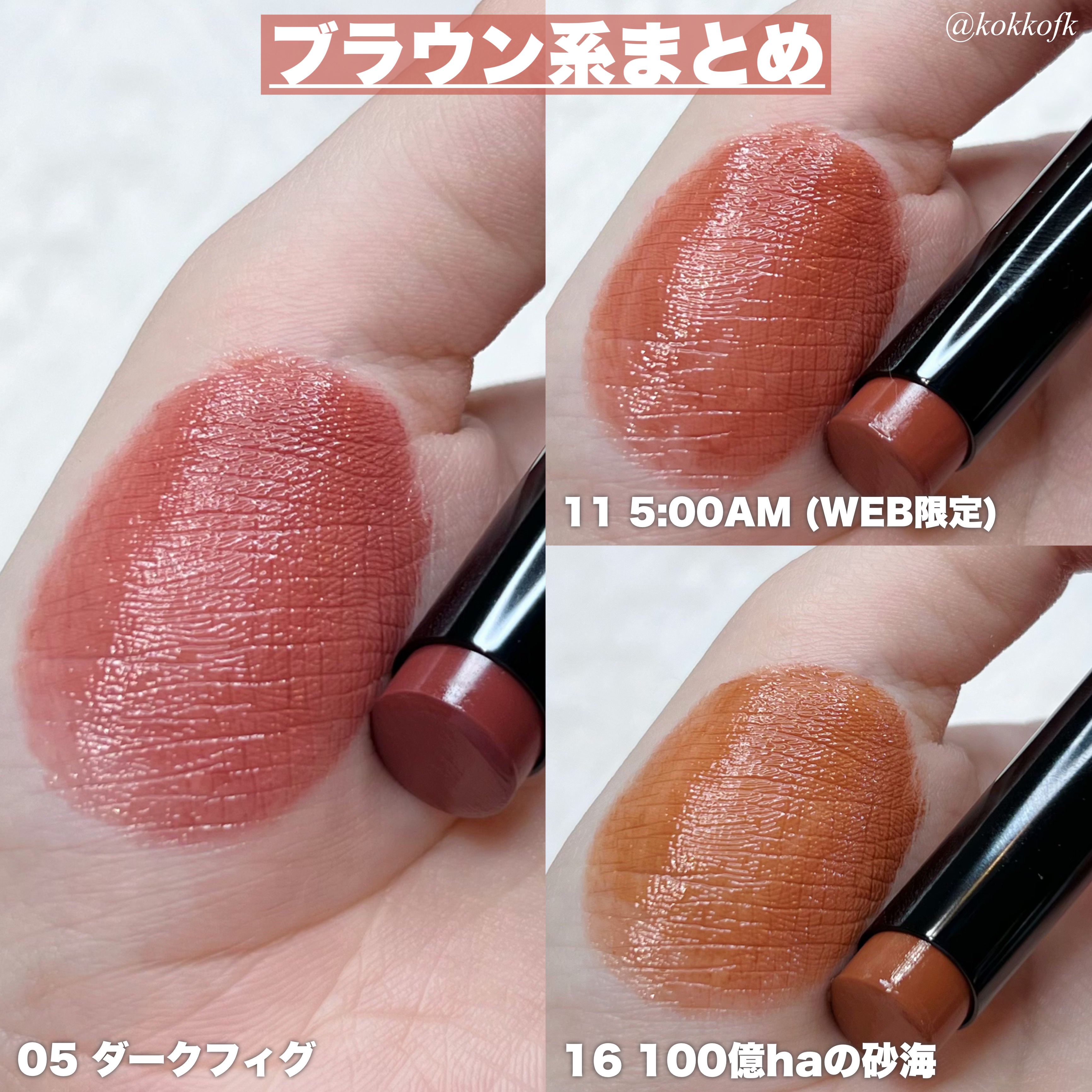 滑らかな塗り心地で高密着・高保湿、色持ちも◎ カラバリ豊富でお気に入りが見つかりやすいですよ🐑 01 欲望の塊(夏冬)web限定 ▶︎青みがかったクリアピンクレッド 明るさ・クリアが得意な方に◎ 04 パンプキンワイン(秋) ▶︎黄みしっかりこっくりオレンジブラウン 黄み・深みのある色が得意な方に◎