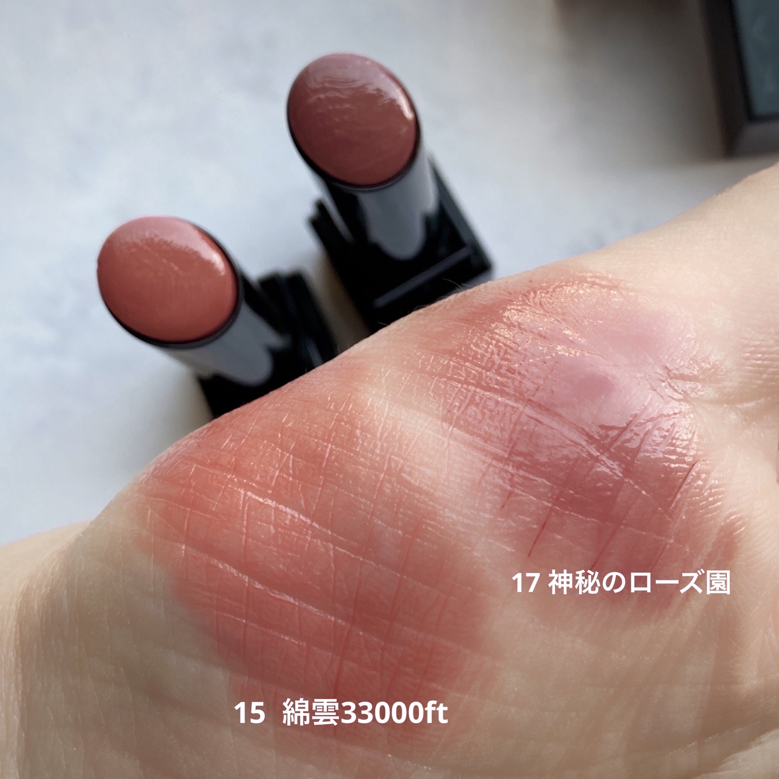 美発色で落ちにくいリップ♪ 唇から蒸発する水分を活用して、密着ジェル膜にすることで つけたての色が持続するんだそう! ▶15 綿雲33000ft 茜色の綿雲みたいなレッドブラウン。シアーな明るめカラーで上品な印象♡ ▶17 神秘のローズ園 バラのようなローズレッド。低めのトーンで華やかさと上品さのバランスが良い♪