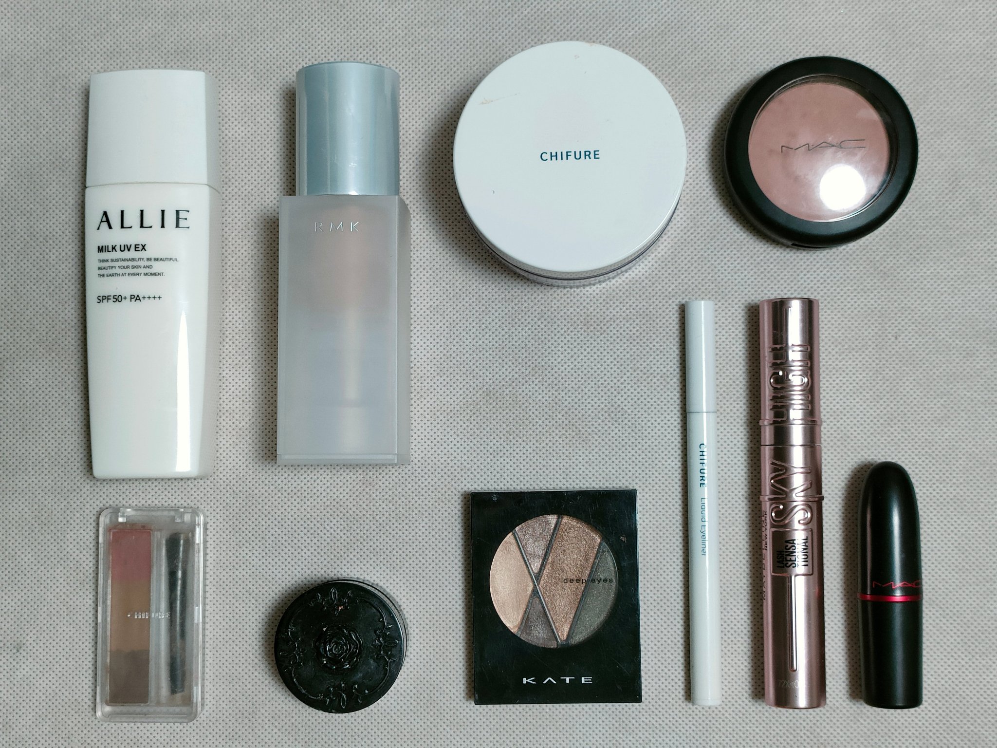 アリィー ニュアンスチェンジUV ジェル RSを、顔全体にまんべんなく塗ります。 RMK RMK ジェルクリーミィファンデーション 103を、顔全体にまんべんなく塗ります。 ジョンソンベビー ジョンソン ベビーパウダーを、顔全体にまんべんなく軽くはたきます。 THE BODY SHOP bronze shade warm glowを、両頬に塗ります。 KATE リフレクトミラーアイズ BR-1の締め色を、眉毛全体にまんべんなく塗ります。 URGLAM UR GLAMBLOOMING EYE COLOR PALETTE 01を、使用しました。 ちふれ リキッド アイライナー 筆ペンタイプ BK30 ブラックを、塗ります。 CEZANNE エアリーカールマスカラを、まつ毛全体にまんべんなく塗ります。 MAYBELLINE NEW YORK コロッサルボリュームエクスプレスを、まつ毛全体にまんべんなく塗ります。 MAYBELLINE NEW YORK SPステイ マットインク 135を、唇全体にまんべんなく塗ります。