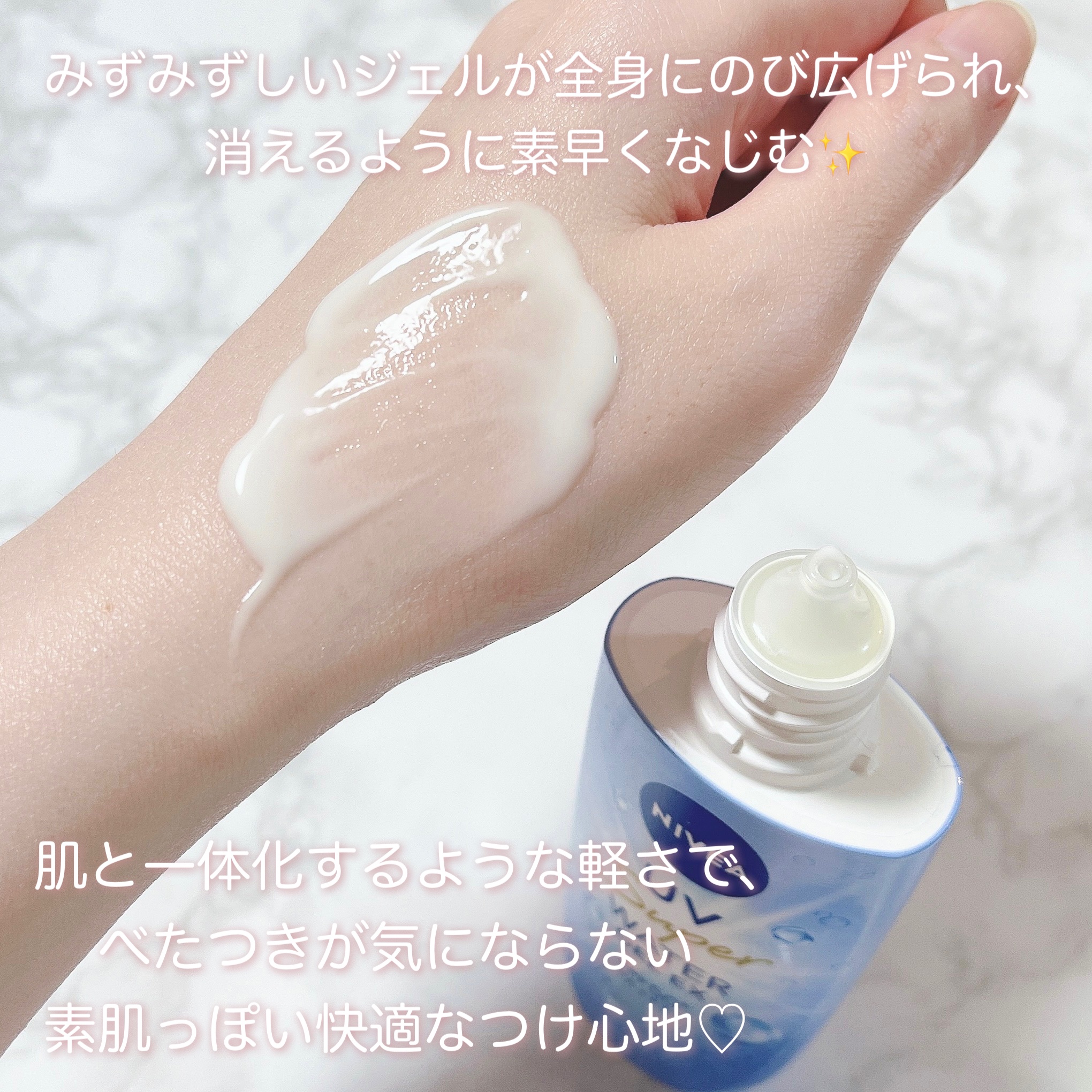 - 圧倒的にみずみずしい!(*1)消えるようになじむ 日やけ・乾燥予防UV ●圧倒的にみずみずしい!(*1) 消えるようになじむ みずみずしいジェルまたはエッセンスが全身にのび広げられ、消えるように素早くなじみます。肌と一体化するような軽さで、べたつきが気にならない素肌っぽい快適な使い心地。 ●SPF50+/PA++++/UV耐水性★★ 強烈紫外線から素肌をしっかりまもる。主にシミの原因となるUV-Bも、ハリ・弾力低下の原因となるUV-Aもしっかり防ぎます。 ●汗・水に強い 汗・水に強く落ちにくい。汗・水に触れても強烈紫外線をカットします。海、プール、スポーツ、レジャー、強い日差しの外出時にもおすすめです。 ●肌にうるおいを与えて透明感あふれる素肌へ うるおいによる透明感を追求した厳選成分クリアウォーターα(保湿)(*3)配合の化粧水ベース70%(*4)処方で、素肌を乾燥からまもります。 (*1) ニベアUVシリーズSPF50+/PA++++製品内における使用感 (*3) マンニトール、浸透(※)型ヒアルロン酸(加水分解ヒアルロン酸)、センチフォリアバラ花水、PG (※)角層まで (*4) 水(基剤)+クリアウォーターα(保湿)のこと 〇スーパーウォータープルーフ 〇せっけんで落とせる(専用クレンジング不要) 〇顔・からだ用 〇化粧下地に使える 〇鉱物油フリー、合成着色剤フリー、パラベンフリー、パウダーフリー 〇優しいほのかなフローラルアロマの香り 〇アレルギーテスト済み(すべての方にアレルギーが起こらないというわけではありません)