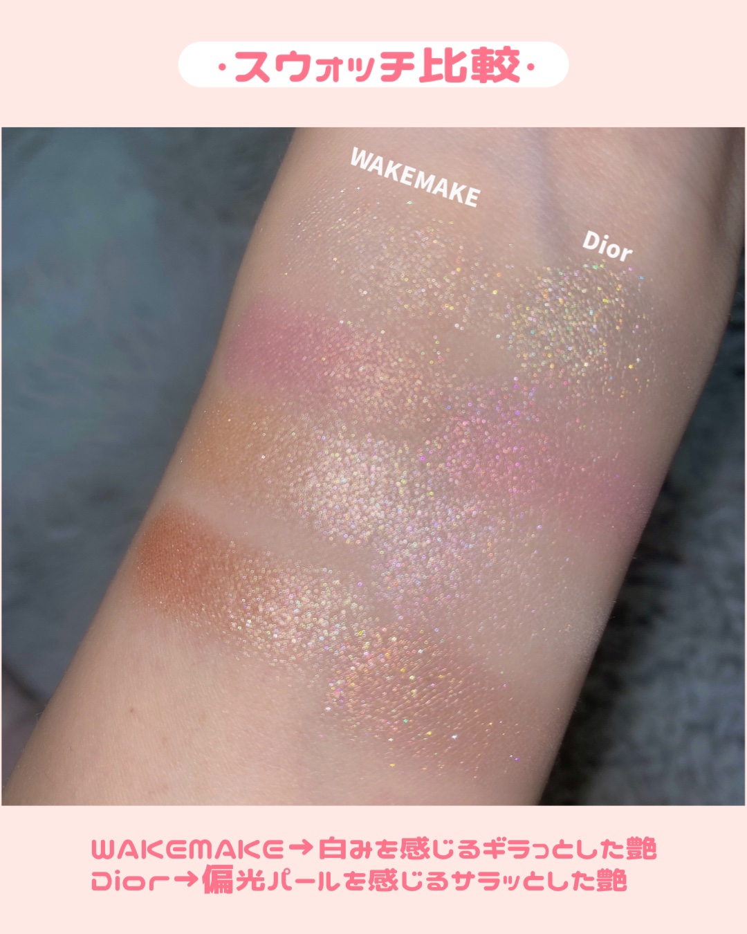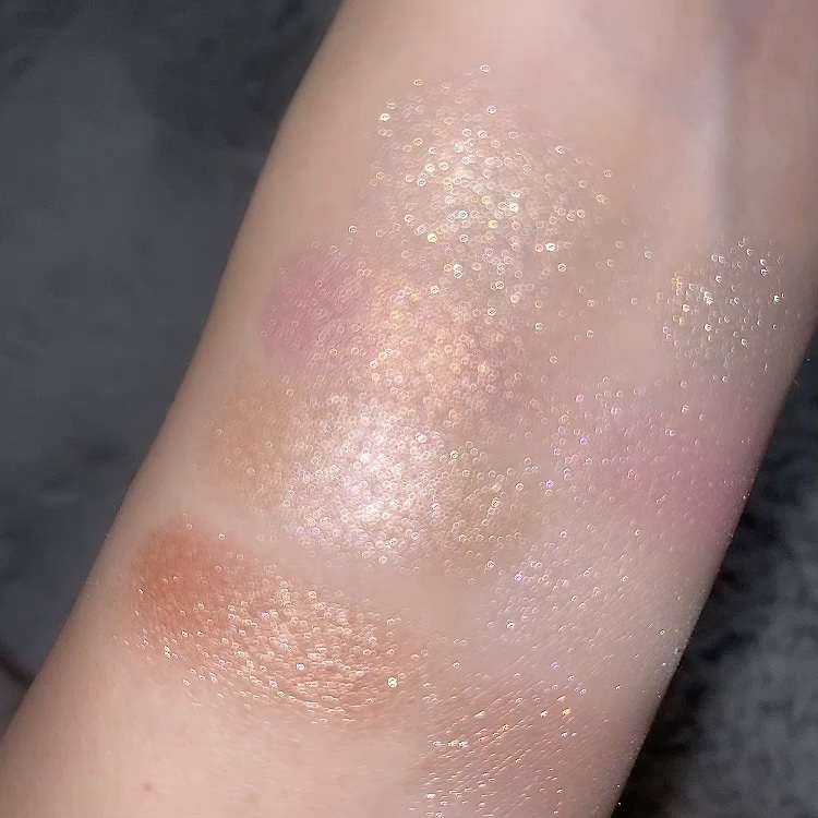 粉質がしっとりしていて 最初触った時びっくりしました。 WAKEMAKEのアイシャドウみたいなテクスチャーで、もっと繊細なイメージかも💭 特に右下はハイライトにしては色が濃いけどアイシャドウとして使ってみたら綺麗でした✨