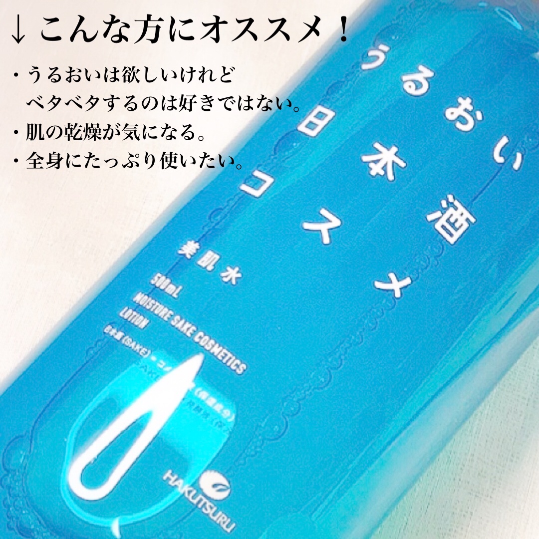 - 白鶴の発酵保湿成分・コメ発酵液(日本酒)やナイアシンアミド(保湿成分)を配合したベタつかないみずみずしい化粧水です。自然の恵みをギュっと閉じ込めた化粧水がお肌にうるおいを与え、肌荒れを防いで健やかなお肌に整えます。サラサラとしたさっぱりとしたテクスチャなので、ボディケアにもおすすめです。